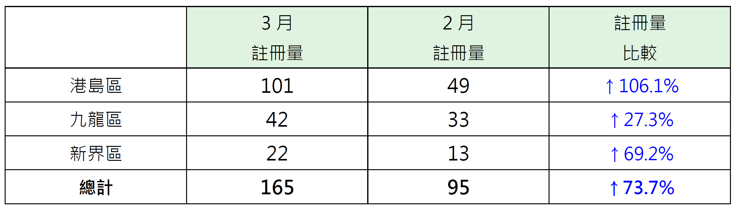 若以港島、九龍及新界三區劃分3月逾2,000萬元二手住宅註冊量表現,其中港島區錄101宗註冊,較2月的49宗增加約106.1%;新界區錄22宗註冊,較2月的13宗增加約69.2%;九龍區錄42宗註冊,較2月的33宗增加約27.3%(見表)。