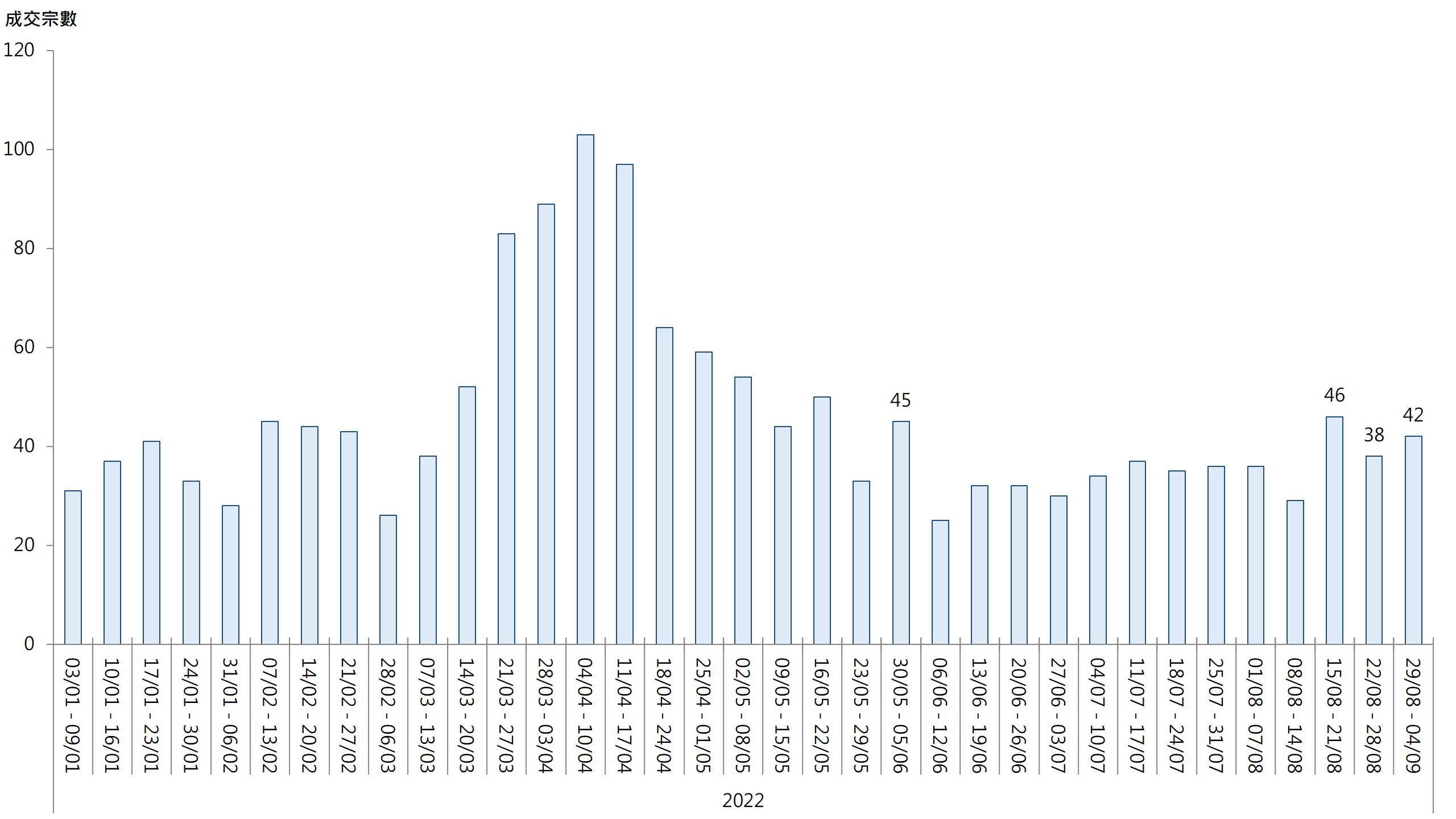 圖︰20大屋苑每周二手買賣成交宗數走勢