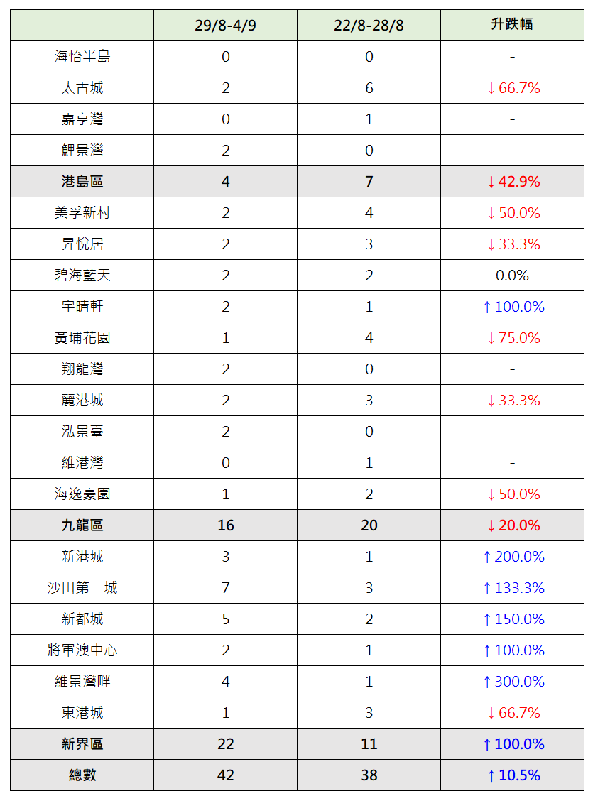 據本行前線分行所錄得的數字顯示,綜合過去一星期(8月29日至9月4日)全港20大主要屋苑二手買賣錄42宗二手成交,較前周(8月22日至8月28日)的38宗增加約10.5%(見圖)。