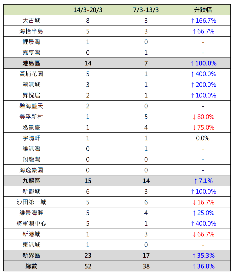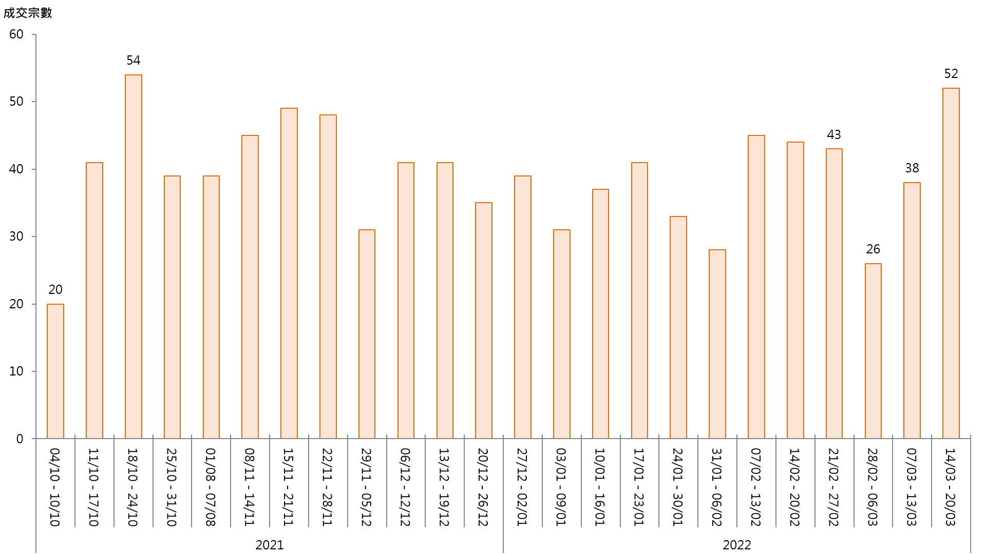放寬按保上限措施,利好樓市氣氛,20大屋苑交投連升2周;據本行前線分行所錄得的數字顯示,綜合過去一星期(3月14日至3月20日)全港20大主要屋苑二手買賣錄52宗成交,較前周(3月7日至3月13日)的38宗增加約36.8%,創21周新高(見圖)。