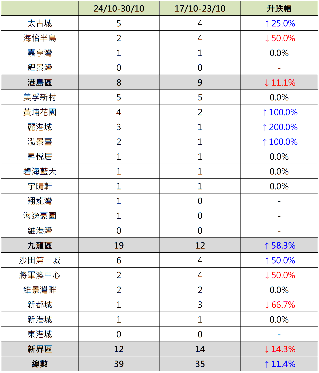 《施政報告》公布後,市場觀望氣氛逐漸消散,二手交投回升;據本行前線分行所錄得的數字顯示,綜合過去一星期(10月24日至10月30日)全港20大主要屋苑二手買賣錄39宗二手成交,較前周(10月17日至10月23日)的35宗增加約11.4%(見圖)。