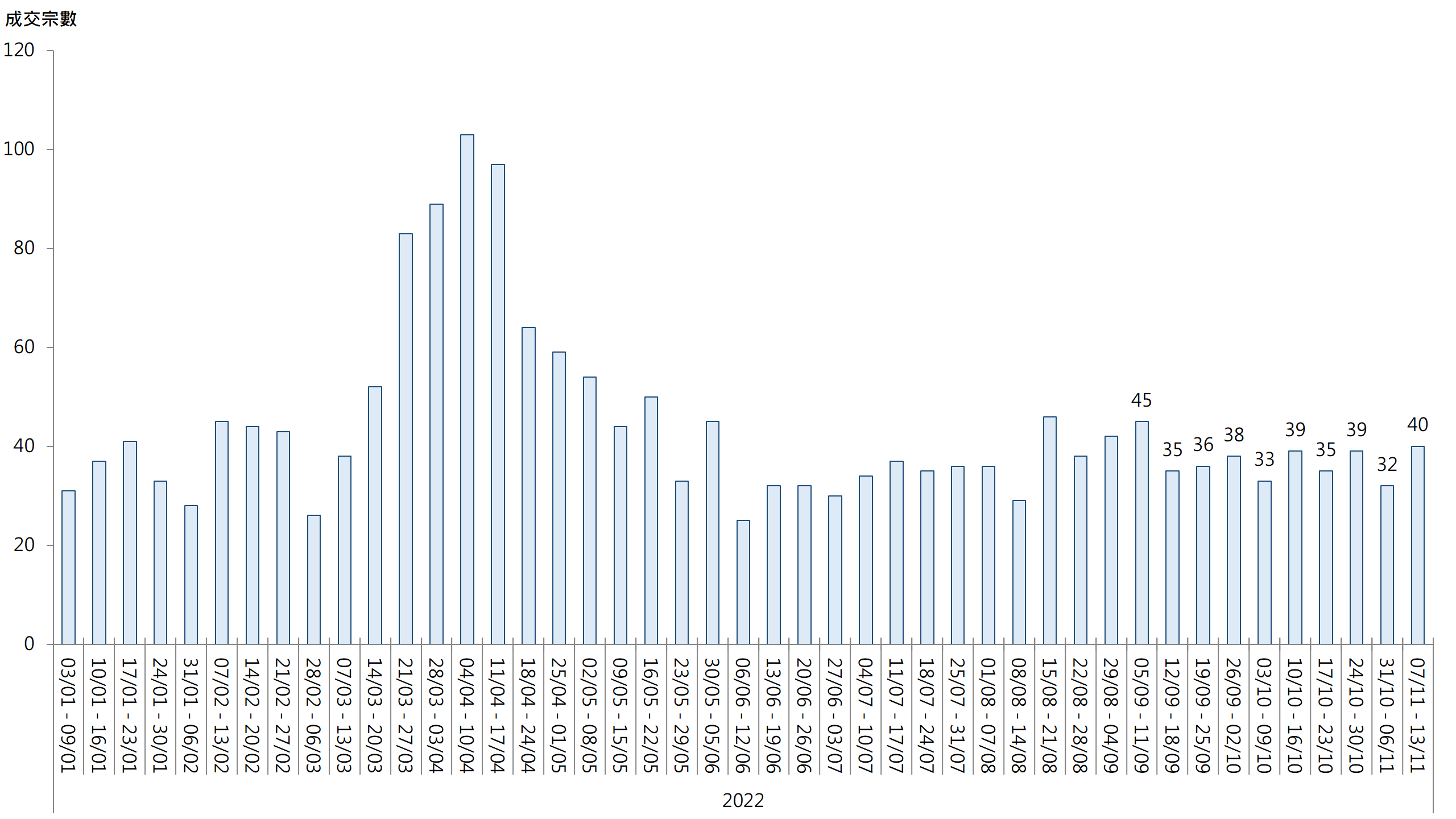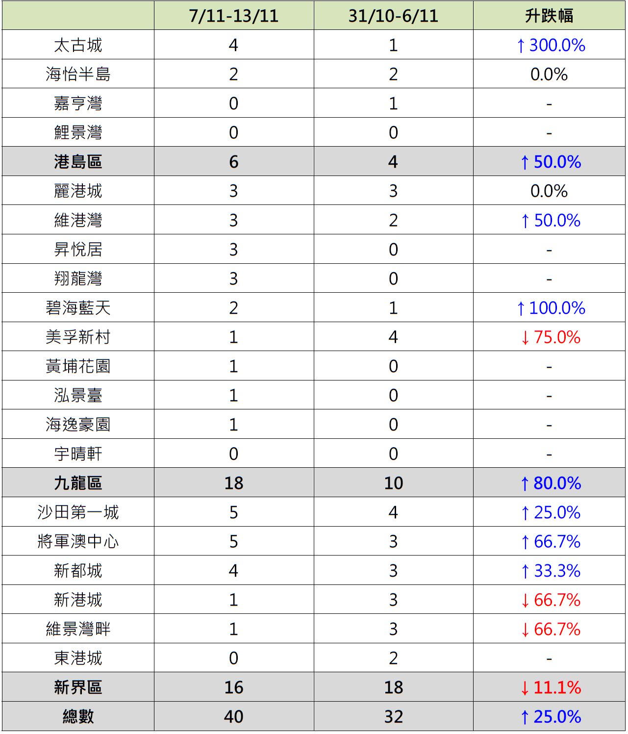 據本行前線分行所錄得的數字顯示,綜合過去一星期(11月7日至11月13日)全港20大主要屋苑二手買賣錄40宗二手成交,較前周(10月31日至11月6日)的32宗增加8宗,或25%(見圖)。