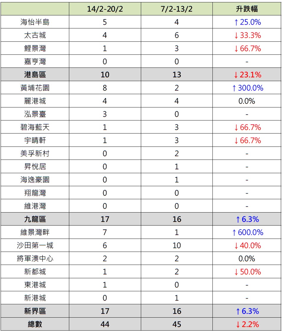 據本行前線分行所錄得的數字顯示,綜合過去一星期(2月14日至2月20日)全港20大主要屋苑二手買賣錄44宗成交,較前周(2月7日至2月13日)的45宗減少約2.2%(見圖)。