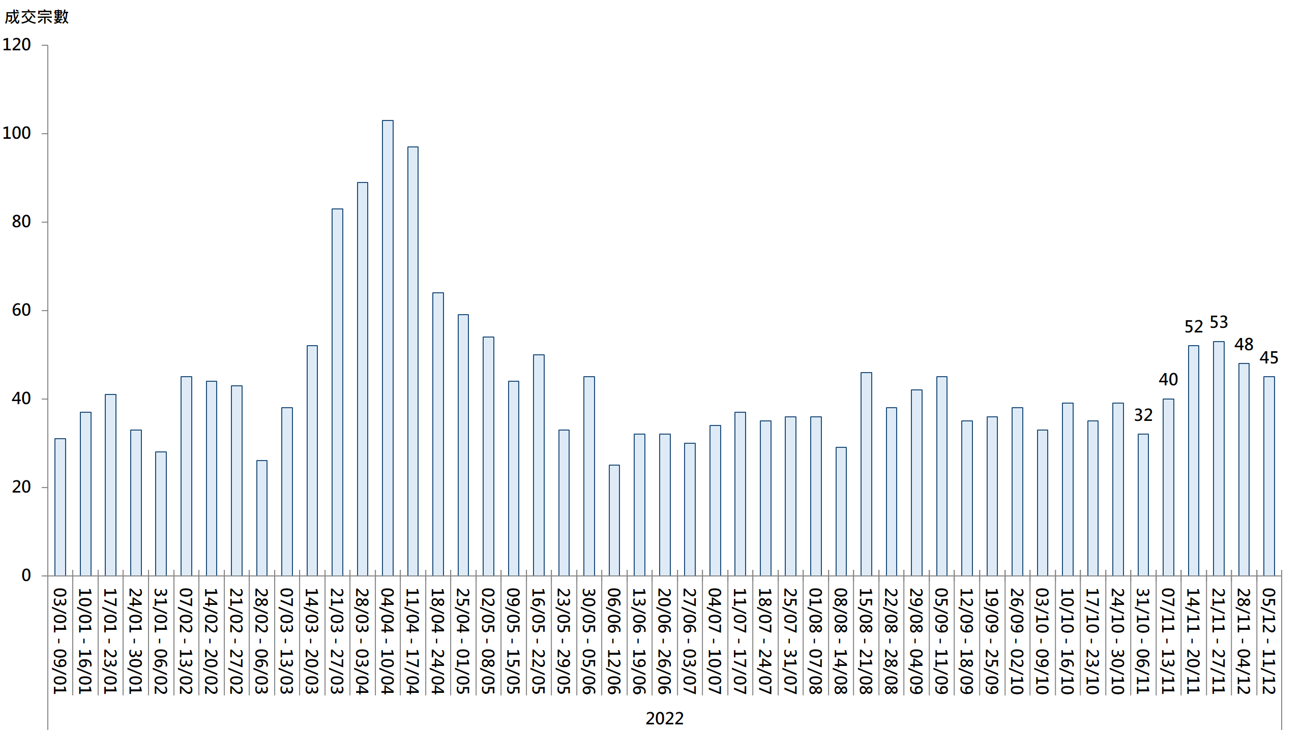 圖︰20大屋苑每周二手買賣成交宗數走勢