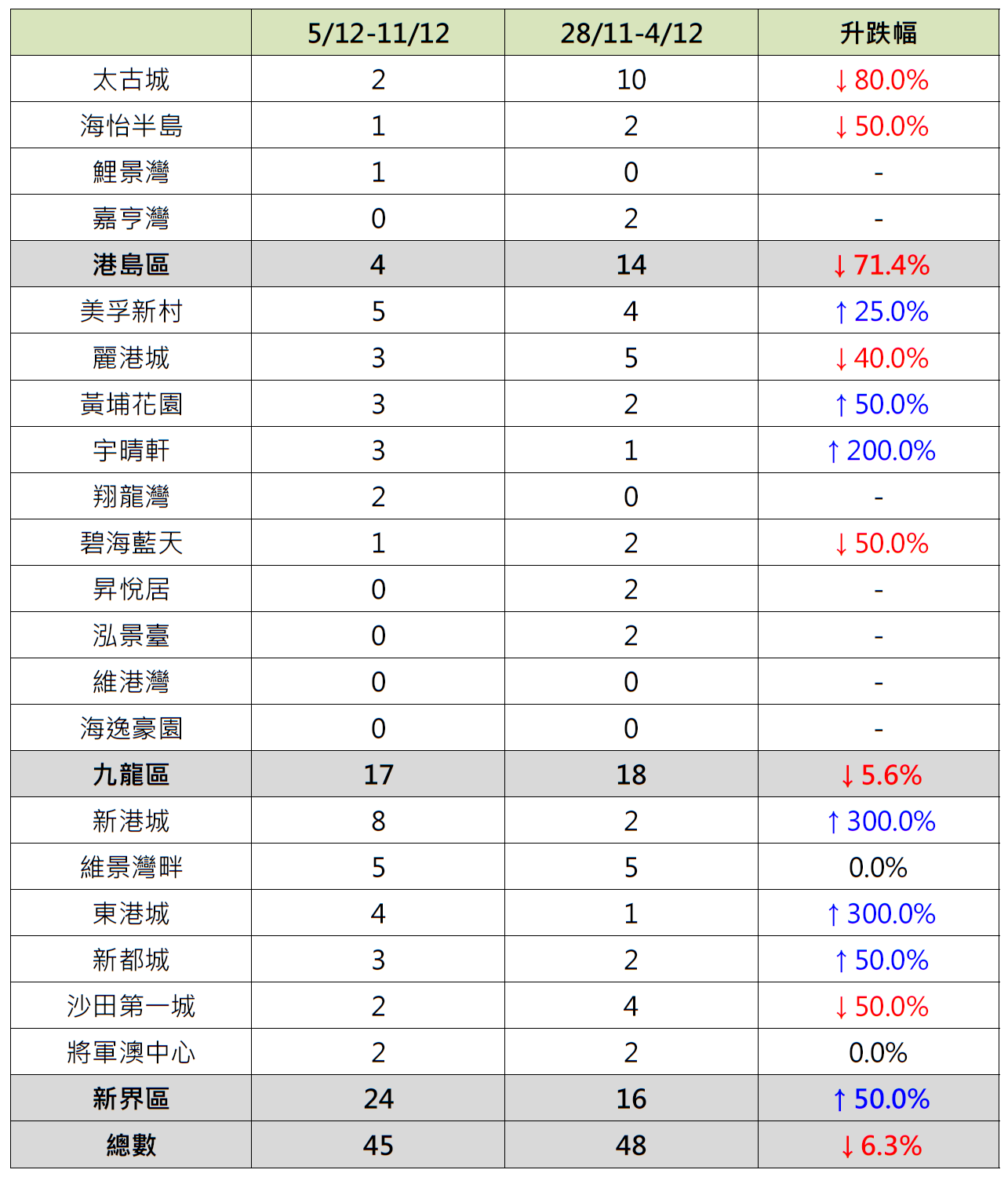 反觀,新界區6個指標屋苑上周錄24宗成交,按周增加50%;當中新都城錄3宗成交,按周增加50%;東港城及新港城各錄4宗及8宗成交,按周同樣增加3倍;相反,沙田第一城錄2宗成交,按周減少50%。