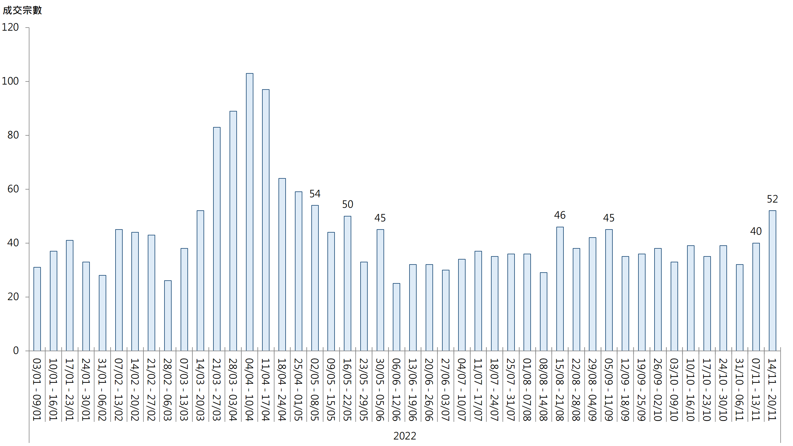 圖︰20大屋苑每周二手買賣成交宗數走勢