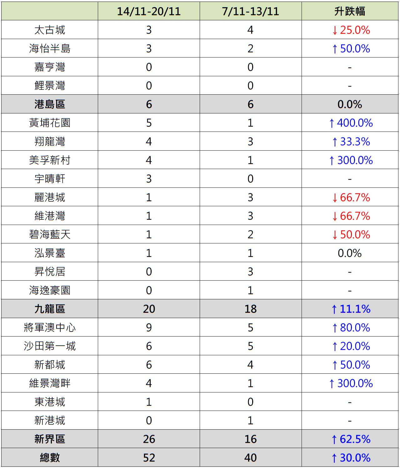 據本行前線分行所錄得的數字顯示,綜合過去一星期(11月14日至11月20日)全港20大主要屋苑二手買賣錄52宗二手成交,較前周(11月7日至11月13日)的40宗增加12宗,或30%(見圖)。