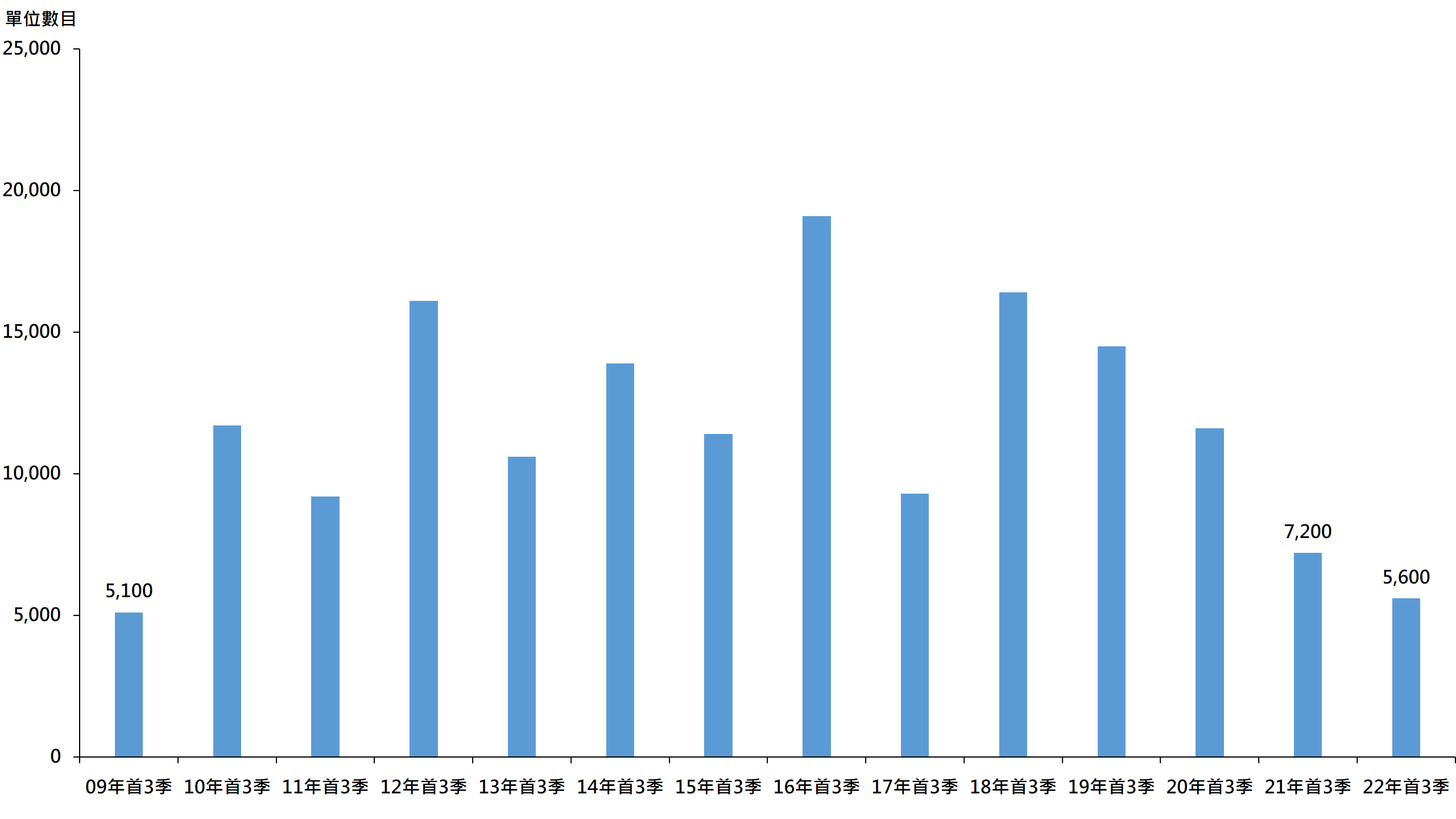 而未來三至四年潛在新供應單位數目(包括建築中未售出單位數目、已落成未售出單位數目及已批出土地可隨時動工項目的單位數目)於第3季錄約95,000伙,較第2季約98,000伙減少約3.1%,主要是因為建築中未售出單位數目由錄第2季約66,000伙,減少約4.5%至第三季約63,000伙;反觀,已落成未售出單位數目錄約15,000伙,較第2季約14,000伙升約7.1%;而已批出土地可隨時動工項目(「熟地」)的單位數目錄約17,000伙,按季持平。