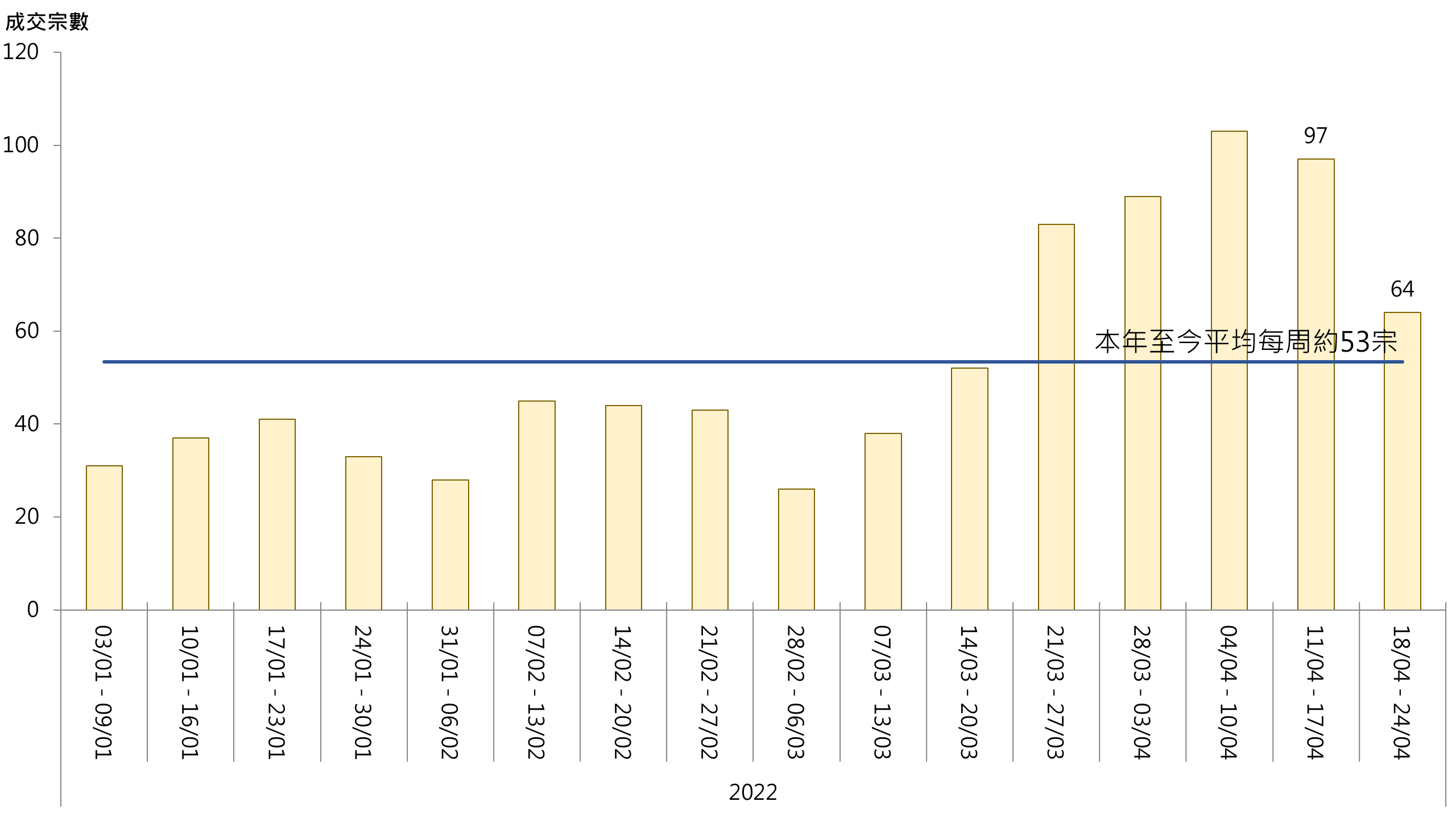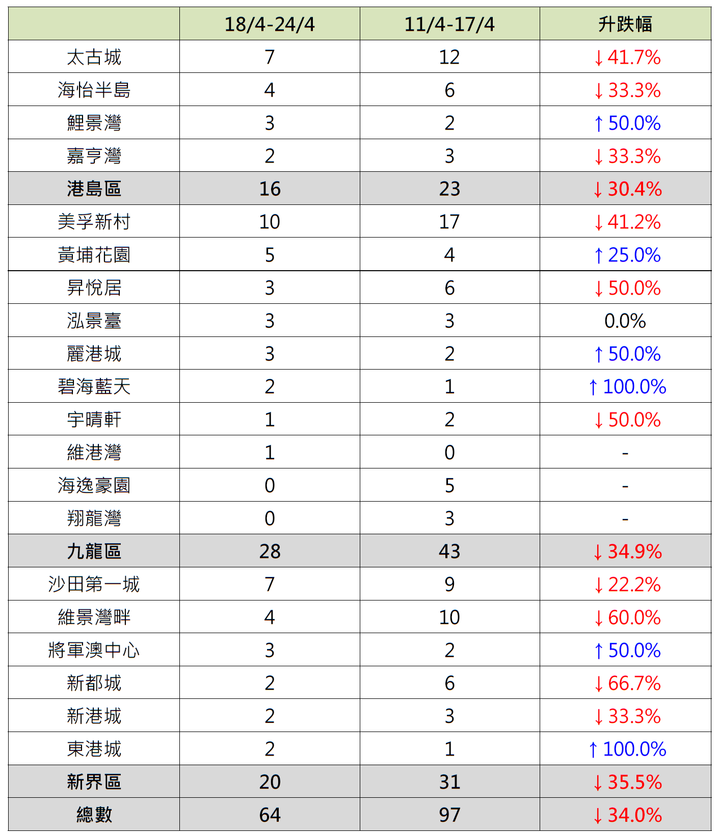 上周末有全新盤登場,搶去市場焦點,惟二手交投依然不俗;據本行前線分行所錄得的數字顯示,綜合過去一星期(4月18日至4月24日)全港20大主要屋苑二手買賣錄64宗成交,較前周(4月11日至4月17日)的97宗減少約34%;不過,若以本年至今平均每周約53宗作比較,上周交投仍高出約2成(見圖)。