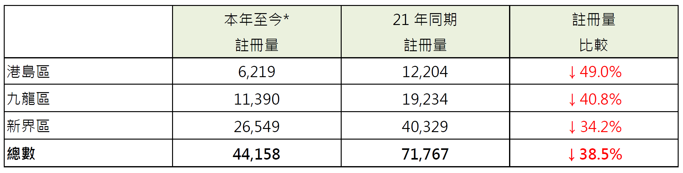 表:本年至今*各區整體住宅物業註冊量與21年同期比較