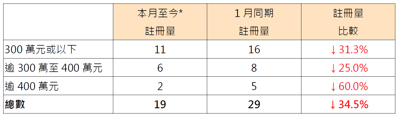 表︰按金額劃分本月至今*二手公屋註冊量與上月同期比較
