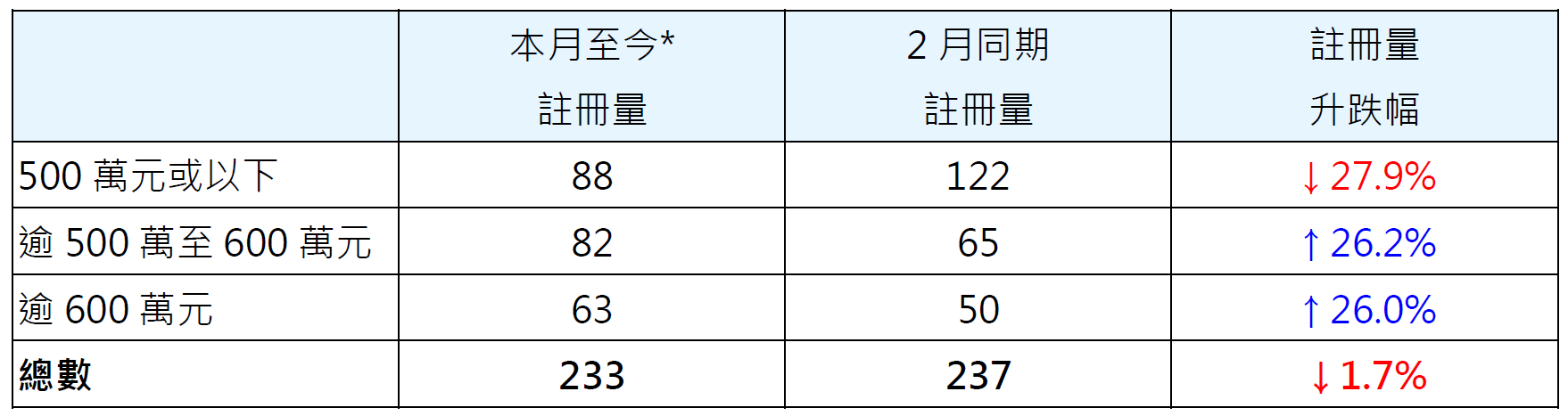 鑑於簽署買賣合約至遞交到土地註冊處註冊登記需時,每月註冊個案一般主要反映前一個月市況