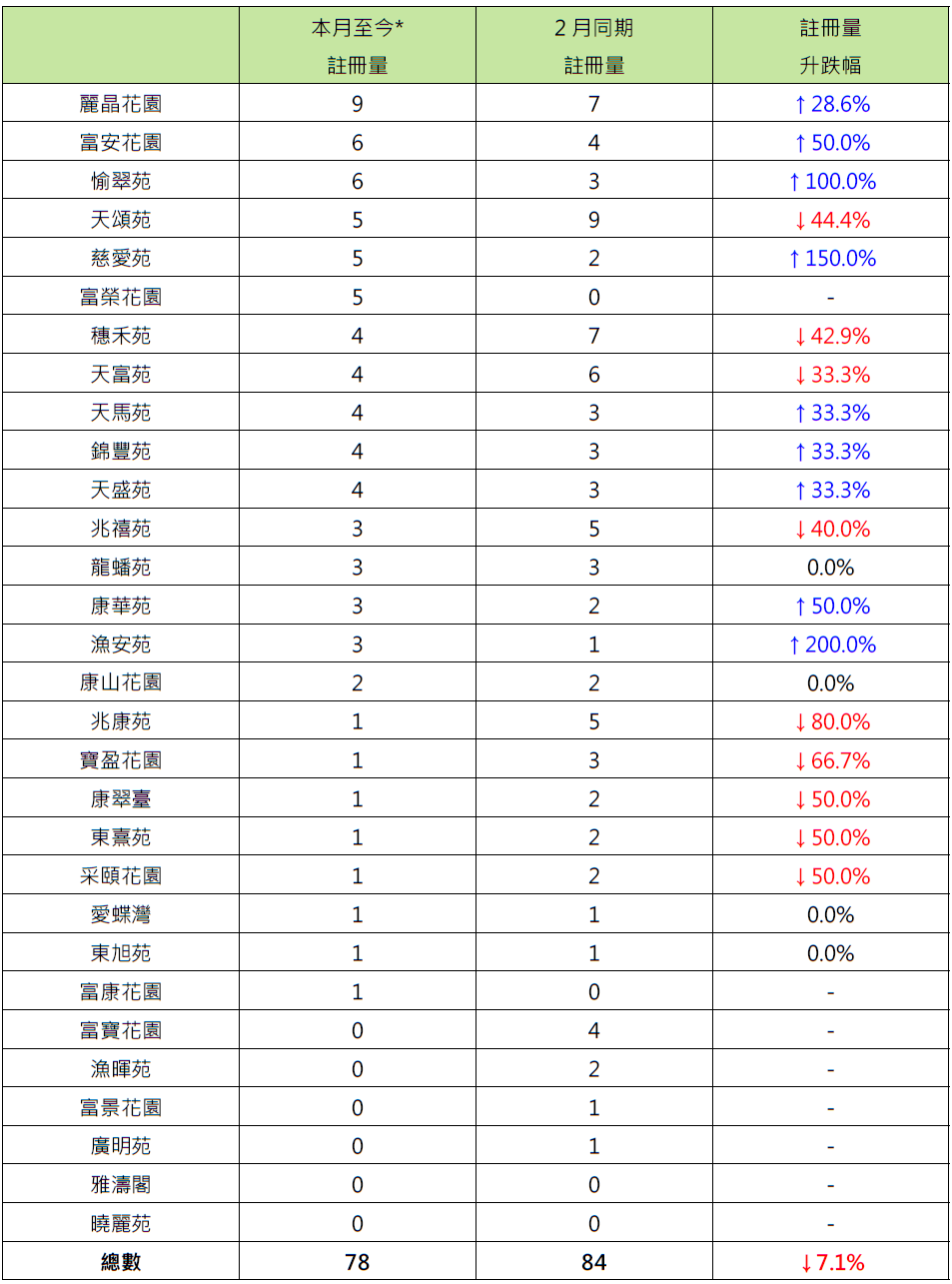 報升屋苑中,鴨脷洲漁安苑錄3宗註冊,較上月同期的1宗增加2倍;慈雲山慈愛苑錄5宗註冊,較上月同期的2宗增加1.5倍;沙田愉翠苑錄6宗註冊,較上月同期的3宗增加1倍。