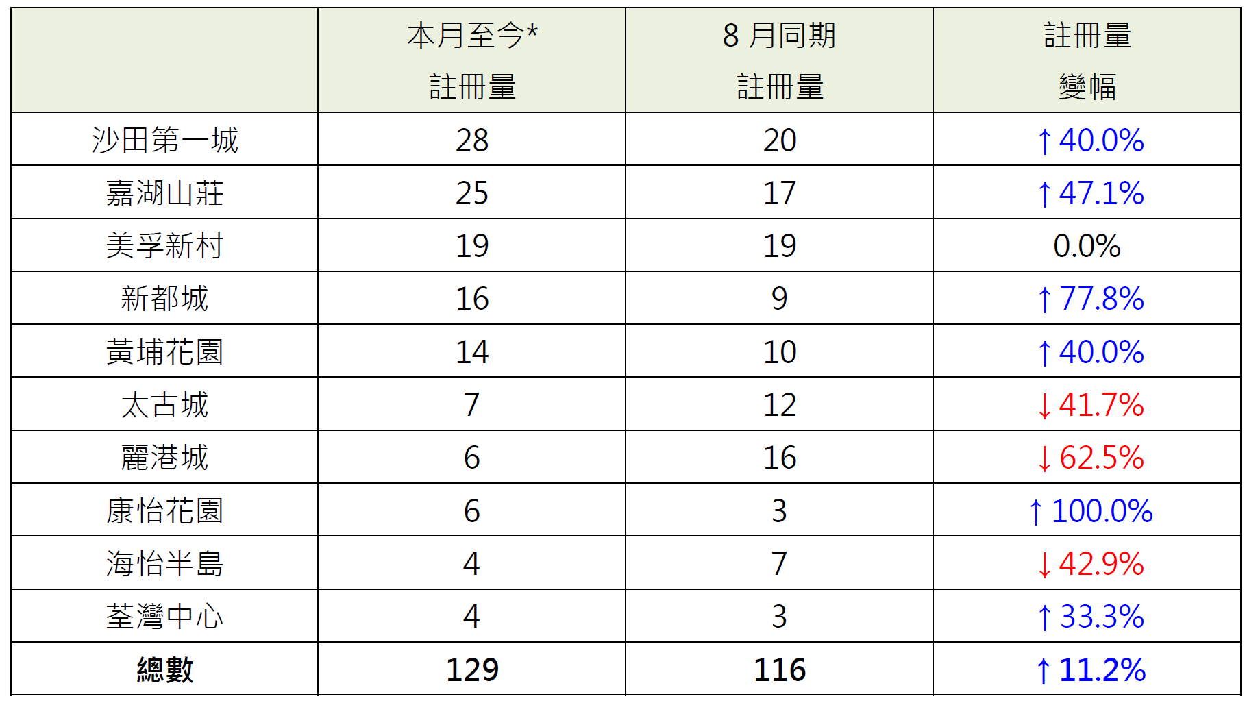 十大傳統屋苑中,有6個屋苑二手住宅註冊量按月同期報升,3個屋苑報跌,1個屋苑持平;報升屋苑中,康怡花園錄6宗註冊,較8月同期的3宗增加1倍;新都城錄16宗註冊,較8月同期的9宗增加約77.8%;嘉湖山莊錄25宗註冊,較8月同期的17宗增加約47.1%。