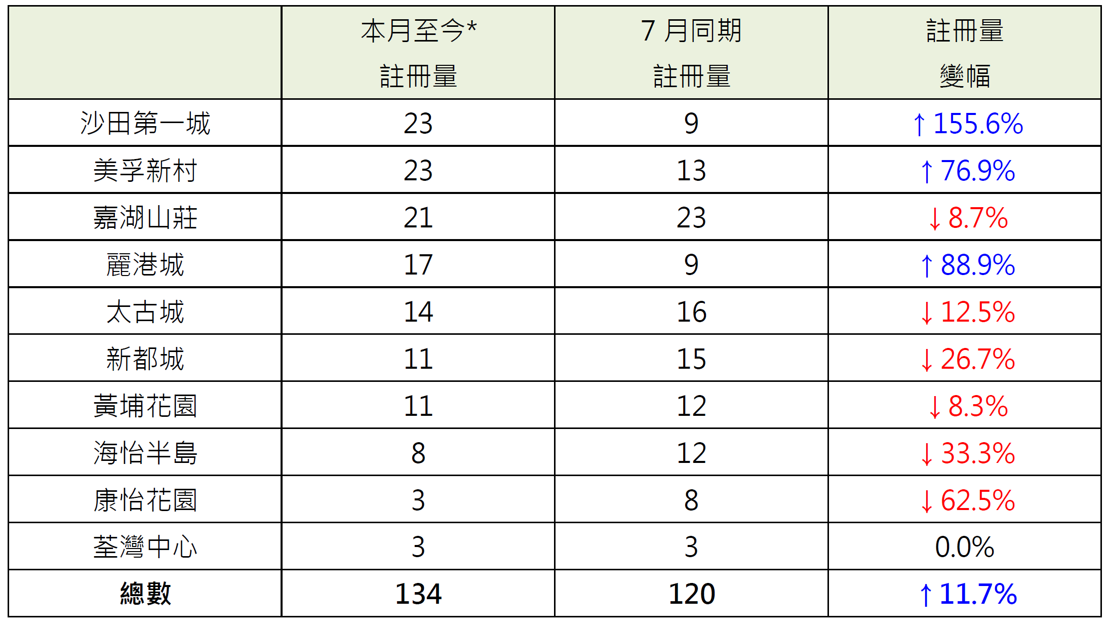十大傳統屋苑中,有3個屋苑二手住宅註冊量按月同期報升,6個屋苑報跌,1個屋苑持平;報升屋苑中,沙田第一城錄23宗註冊,較7月同期的9宗增加逾1.5倍;麗港城錄17宗註冊,較7月同期的9宗增加約88.9%;美孚新村錄23宗註冊,較7月同期的13宗增加約76.9%。