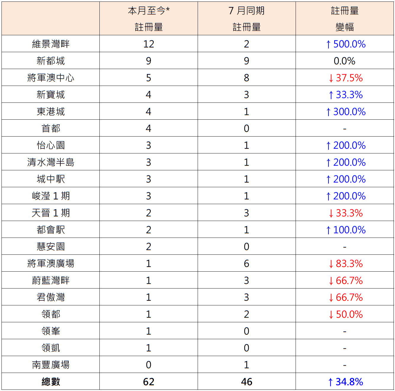 表:本月至今*將軍澳區20個私人屋苑二手住宅註冊量與7月同期比較