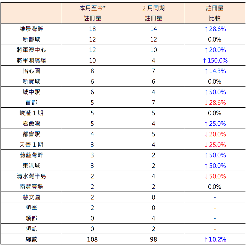 表:本月至今*將軍澳區20個私人屋苑二手住宅註冊量與2月同期比較