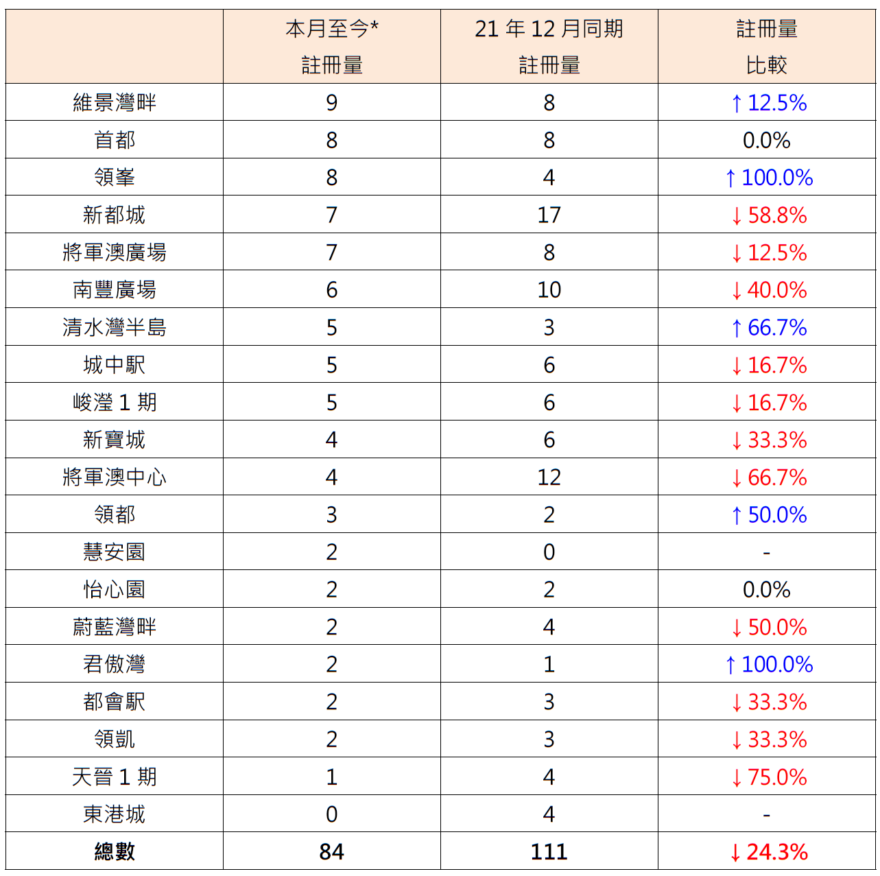 表:本月至今*將軍澳區20個私人屋苑二手住宅註冊量與上月同期比較