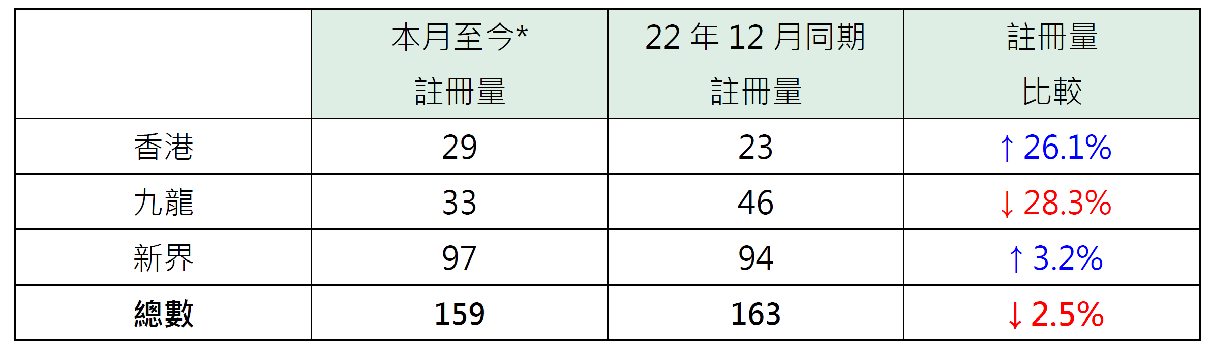 若以三區劃分本月至今純車位註冊量表現,當中九龍區錄33宗註冊,較12月同期的46宗減少約28.3%;反觀,港島區錄29宗註冊,較12月同期的23宗增加約26.1%;新界區錄97宗註冊,較12月同期的94宗增加約3.2%(見表)。