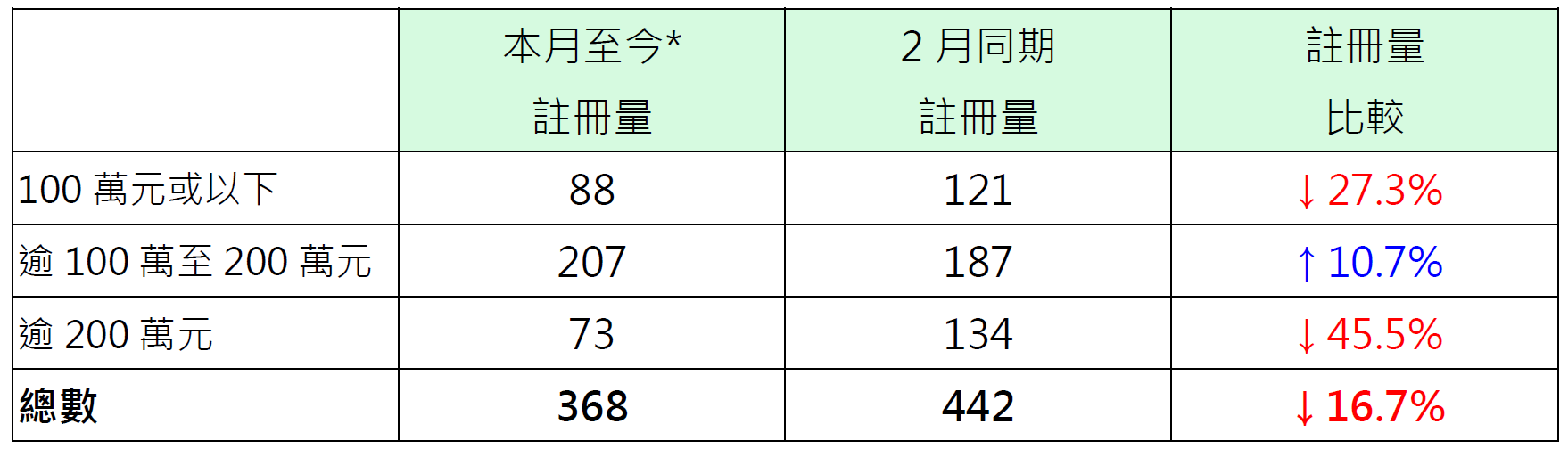 表:本月至今*純車位註冊量與上月同期比較