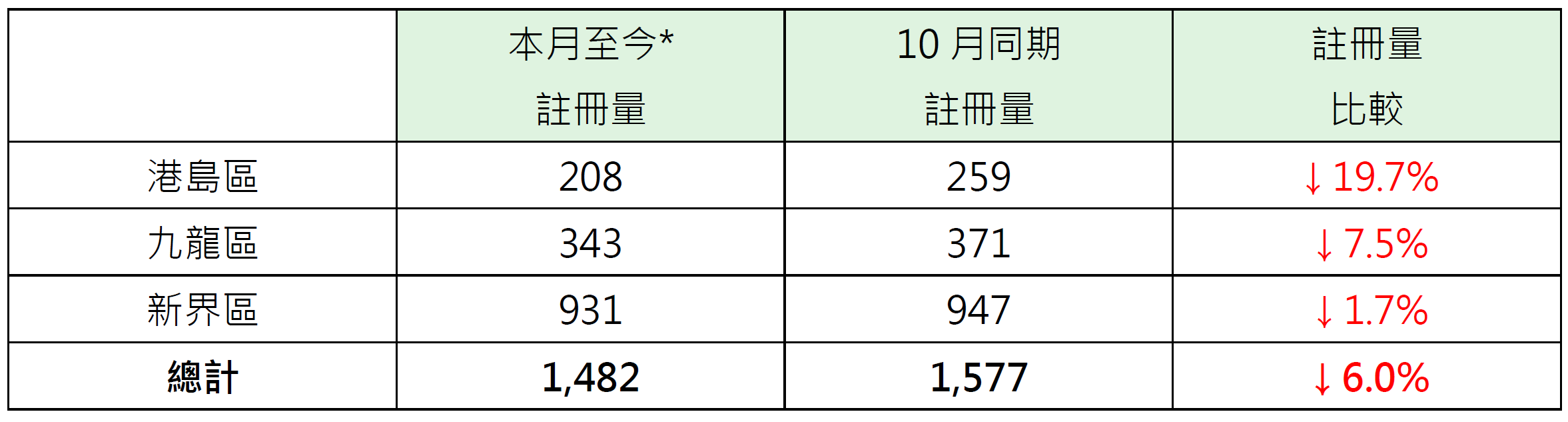 若以港島、九龍及新界三區劃分本月至今逾500萬至1,000萬元二手住宅註冊量表現,其中港島區錄208宗註冊,較10月同期的259宗減少約19.7%;九龍區錄343宗註冊,較10月同期的371宗減少約7.5%;新界區錄931宗註冊,較10月同期的947宗減少約1.7%(見表)。