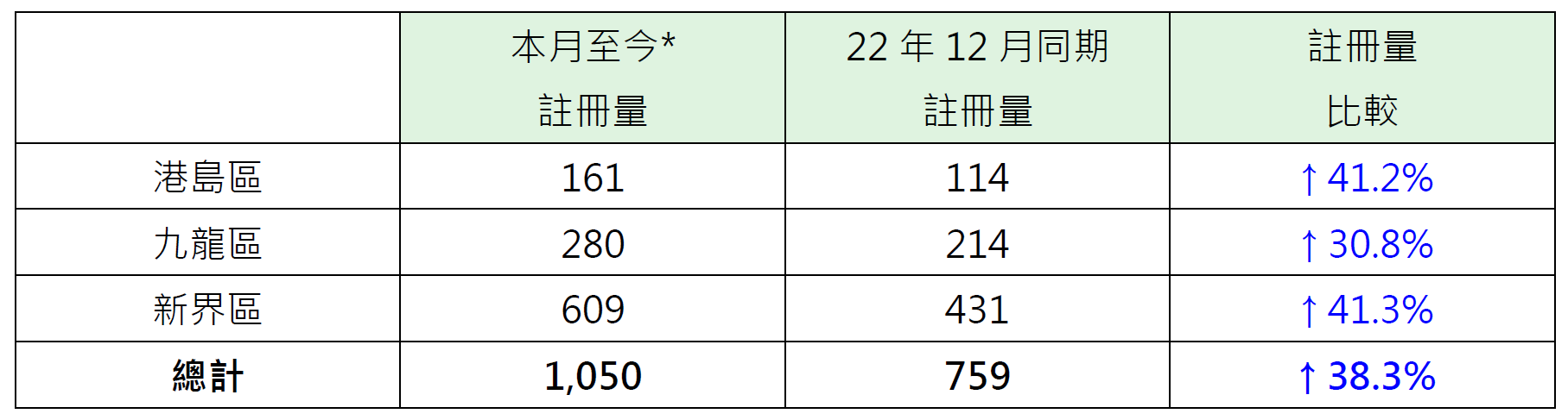 若以港島、九龍及新界三區劃分本月至今逾500萬至1,000萬元二手住宅註冊量表現,其中新界區錄609宗註冊,較12月同期的431宗增加約41.3%;港島區錄161宗註冊,較12月同期的114宗增加約41.2%;九龍區錄280宗註冊,較12月同期的214宗增加約30.8%(見表)。