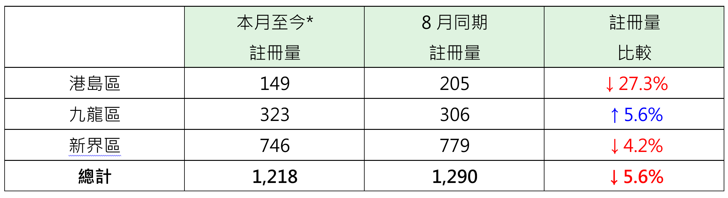 若以港島、九龍及新界三區劃分本月至今逾500萬至1,000萬元二手住宅註冊量表現,其中港島區錄149宗註冊,較8月同期的205宗減少約27.3%;新界區錄746宗註冊,較8月同期的779宗減少約4.2%;相反,九龍區錄323宗註冊,較8月同期的306宗則增加約5.6%(見表)。