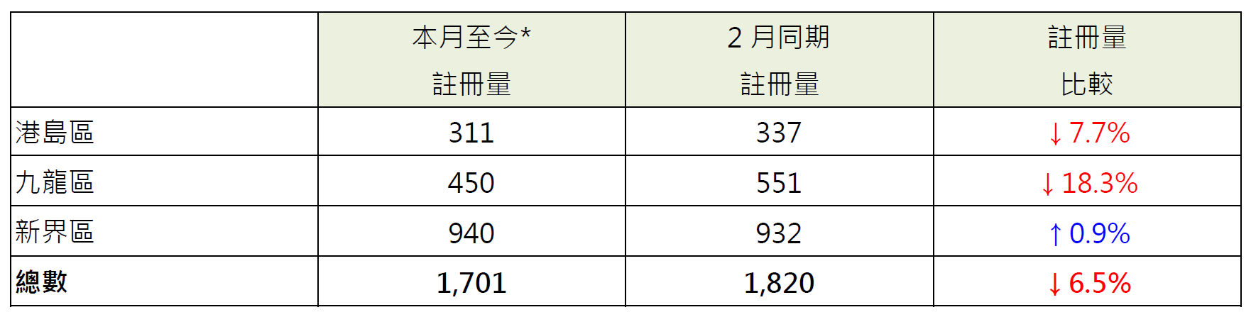 若以港島、九龍及新界三區劃分本月至今住宅物業註冊量表現,當中九龍區錄450宗註冊,較2月同期的551宗減少約18.3%;港島區錄311宗註冊,較2月同期的337宗減少約7.7%;新界區錄940宗註冊,較2月同期的932宗微增不足1%(見表)。