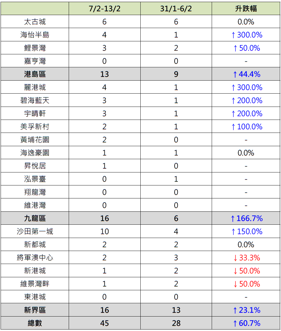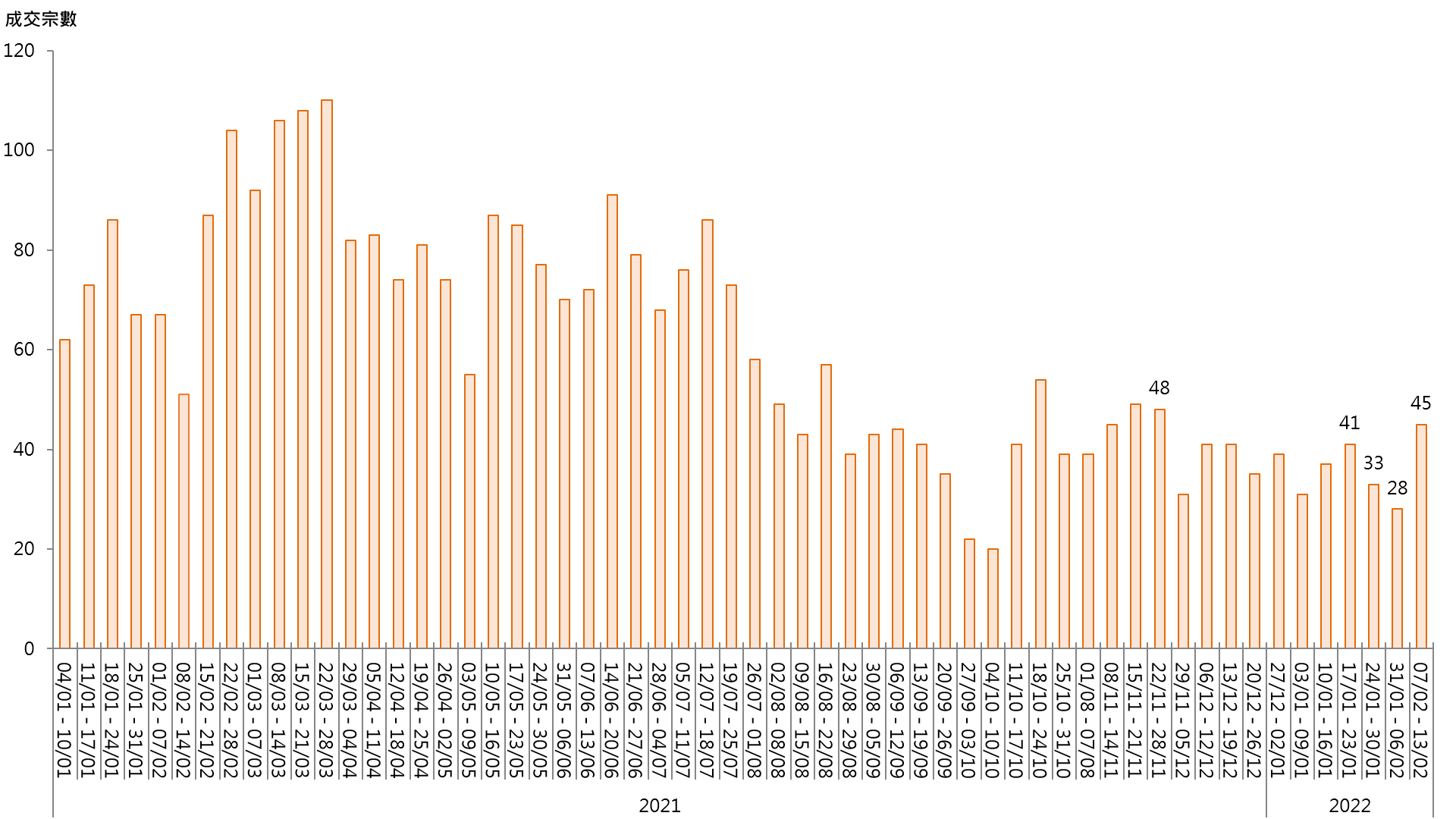 節日過後,二手交投現反彈;據本行前線分行所錄得的數字顯示,綜合過去一星期(2月7日至2月13日)全港20大主要屋苑二手買賣錄45宗成交,較前周(1月31日至2月6日)的28宗增加約60.7%,創近11周新高(見圖)。