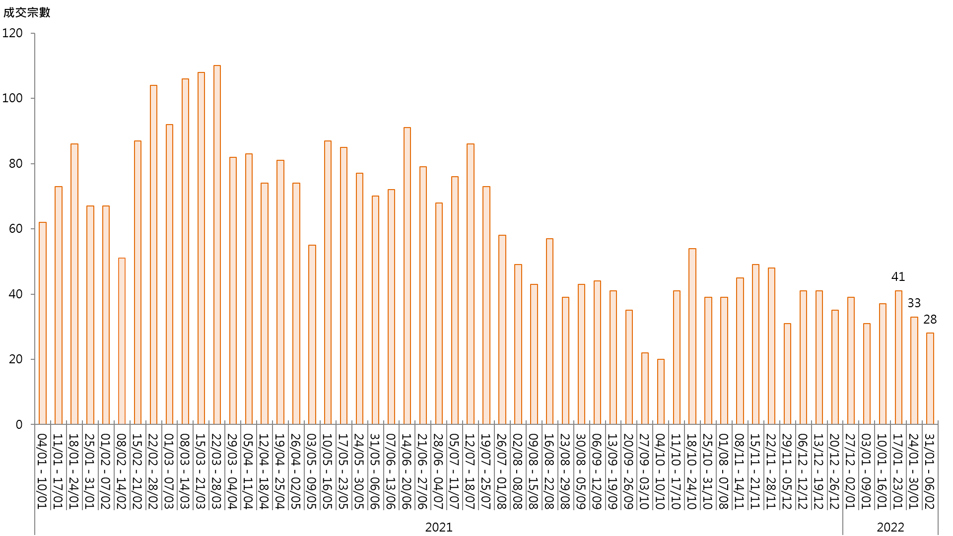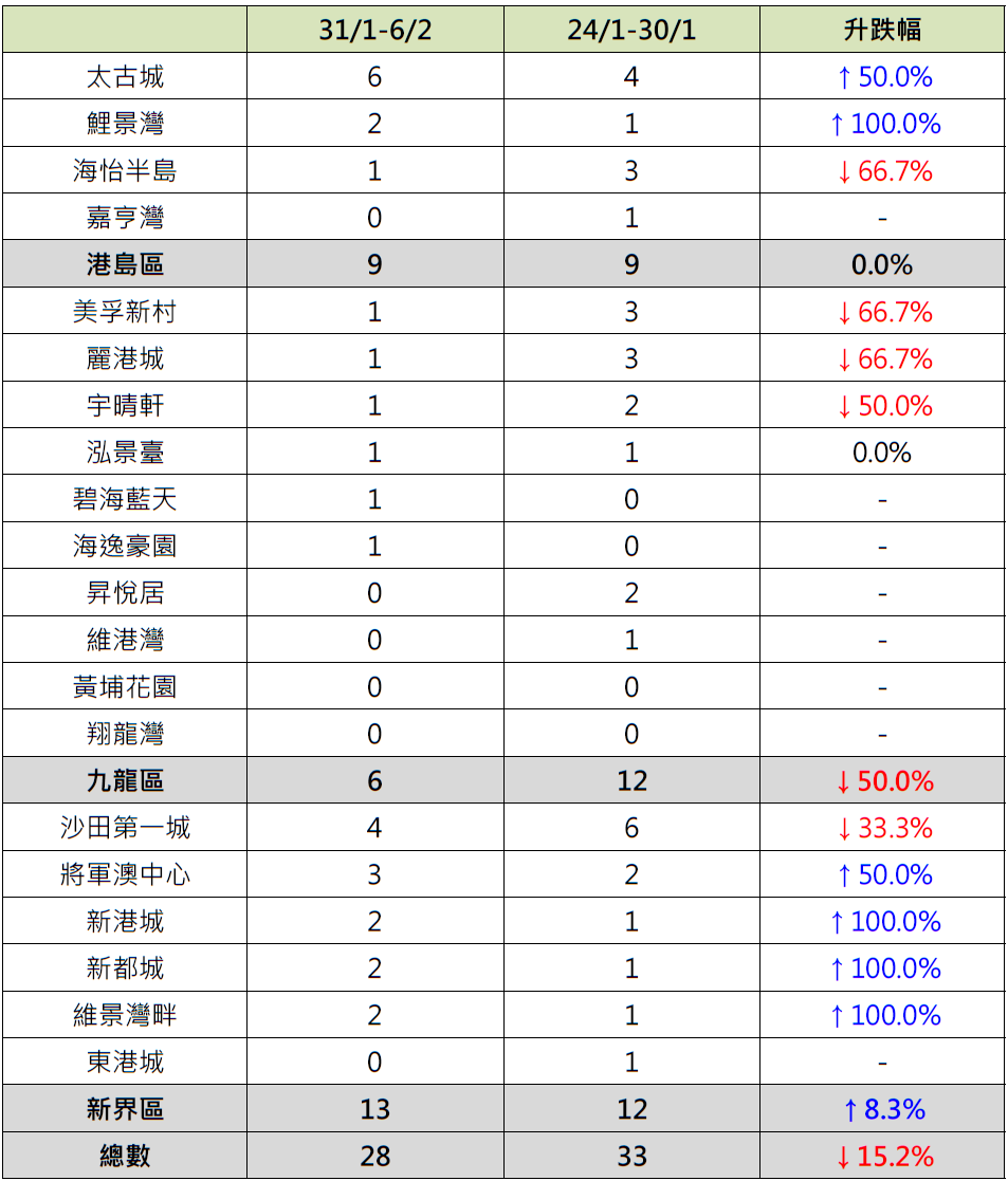 上周正值虎年新春假期,節日氣氛濃厚;據本行前線分行所錄得的數字顯示,綜合過去一星期(1月31日至2月6日)全港20大主要屋苑二手買賣錄28宗成交,較前周(1月24日至1月30日)的33宗減少約15.2%(見圖)。