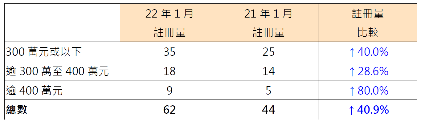 按金額劃分今年1月二手公屋註冊量表現,其中價值逾300萬至400萬元二手公屋錄18宗註冊,較21年1月的14宗增加約28.6%;價值300萬元或以下二手公屋錄35宗註冊,較21年1月的25宗增加40%;價值逾400萬元二手公屋錄9宗註冊,較21年1月的5宗更增加80%(見表)。