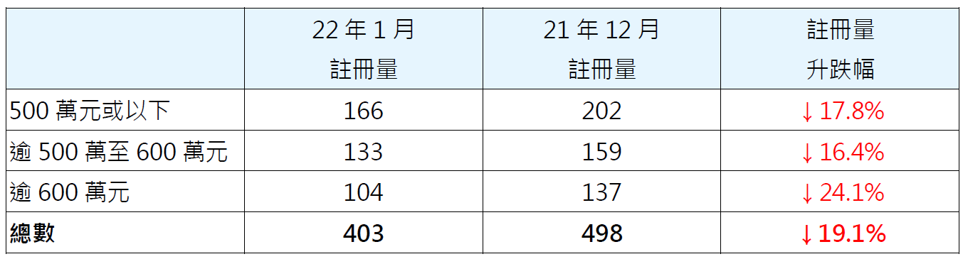 若按金額劃分今年1月二手居屋註冊量表現,其中逾500萬至600萬元二手居屋錄133宗註冊,較去年12月的159宗減少約16.4%;500萬元或以下二手居屋錄166宗註冊,較去年12月的202宗減少約17.8%;逾600萬元二手居屋錄104宗註冊,較去年12月的137宗減少約24.1%(見表一)。