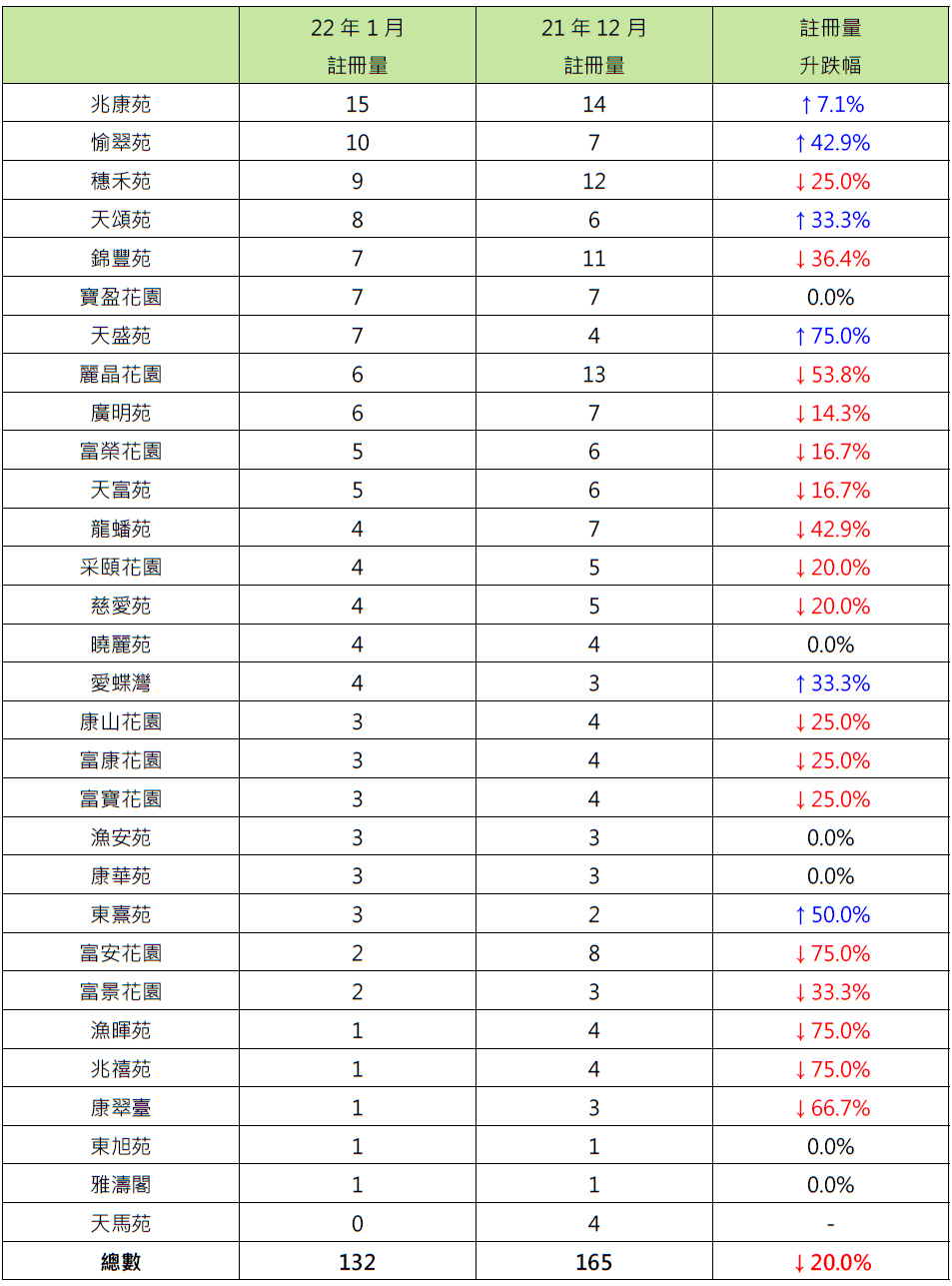 報升屋苑中,天水圍天盛苑錄7宗註冊,較去年12月的4宗增加75%;筲箕灣東熹苑錄3宗註冊,較去年12月的2宗增加50%;沙田愉翠苑錄10宗註冊,較去年12月的7宗增加約42.9%。