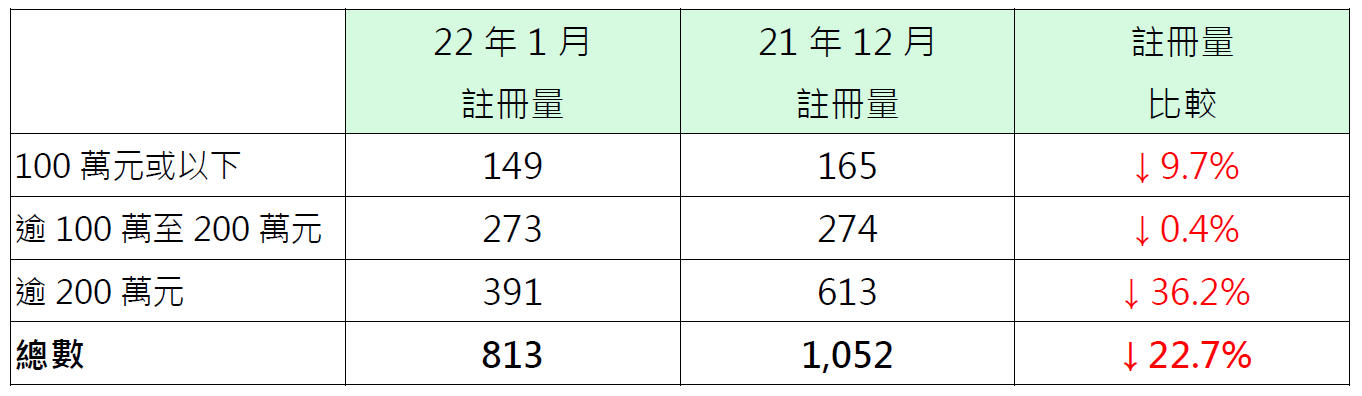 按金額劃分今年1月純車位註冊量表現,其中價值200萬元以上純車位錄391宗註冊,較去年12月的613宗減少約36.2%;價值100萬元或以下純車位錄149宗註冊,較去年12月的165宗減少約9.7%;價值100萬以上至200萬元純車位錄273宗註冊,與去年12月的274宗相若(見表)。