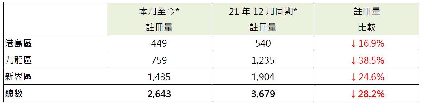 若以港島、九龍及新界三區劃分本月至今住宅物業註冊量表現,當中九龍區錄759宗註冊,較上月同期的1,235宗減少約38.5%;新界區錄1,435宗註冊,較上月同期的1,904宗減少約24.6%;港島區錄449宗註冊,較上月同期的540宗減少約16.9%(見表)。