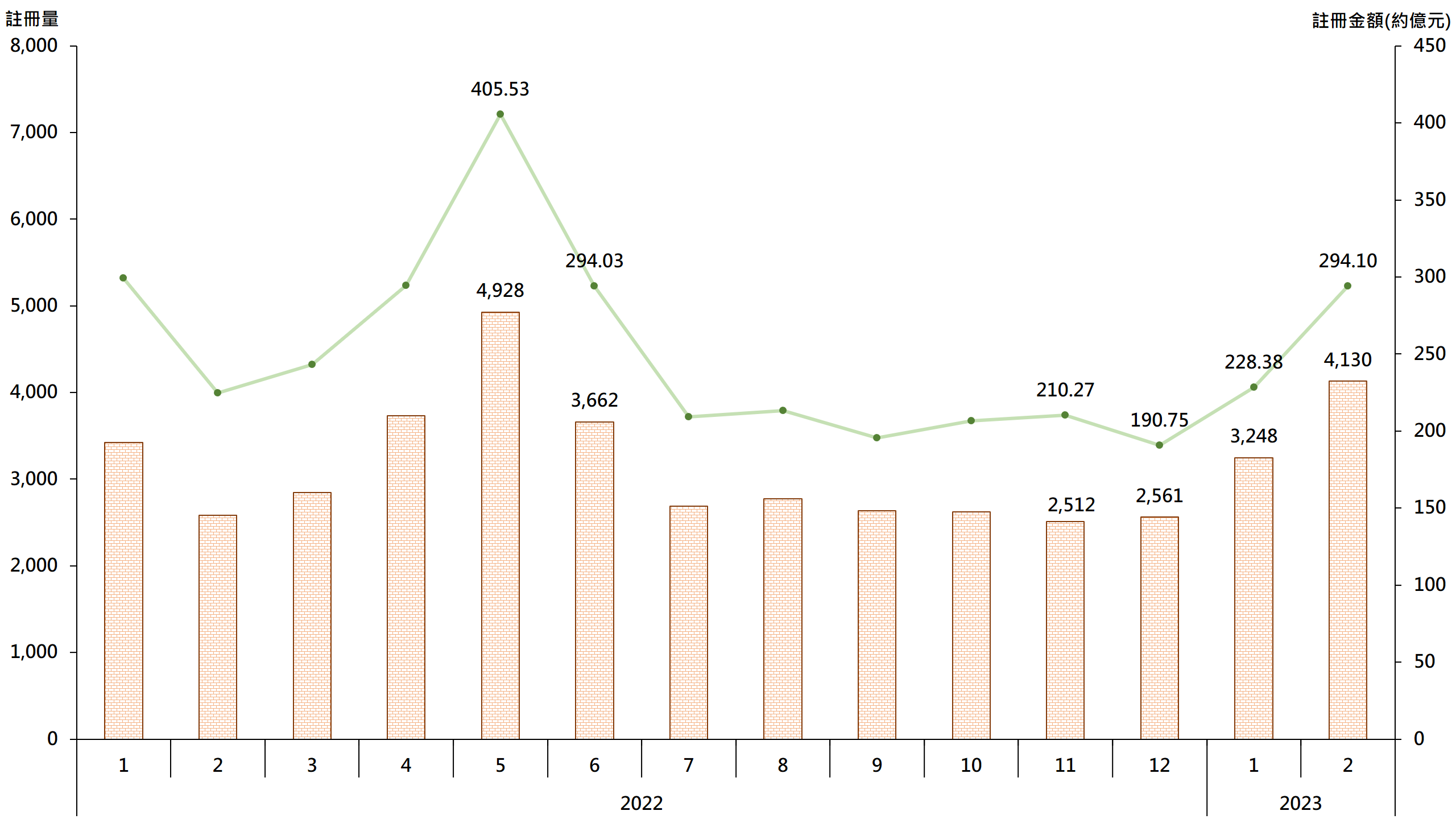 除了宗數外,二手住宅註冊金額亦向上;2月錄約294.1億元,較1月約228.38億元增加約28.8%,與註冊量一樣,連升2個月,創9個月新高(見圖)。