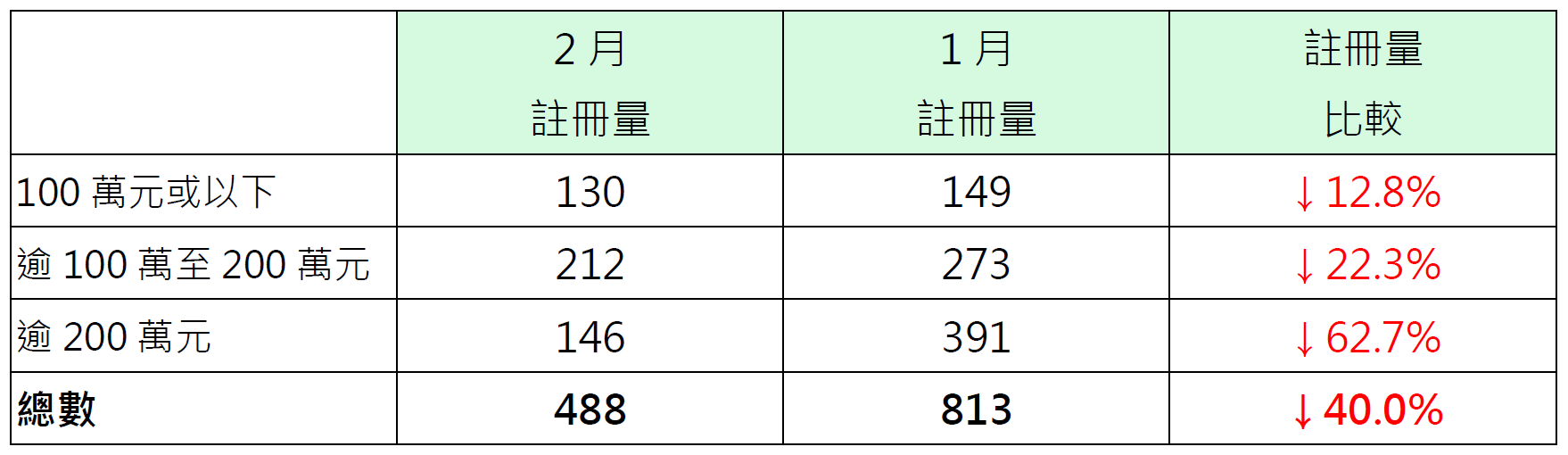 表:2月純車位註冊量與1月比較