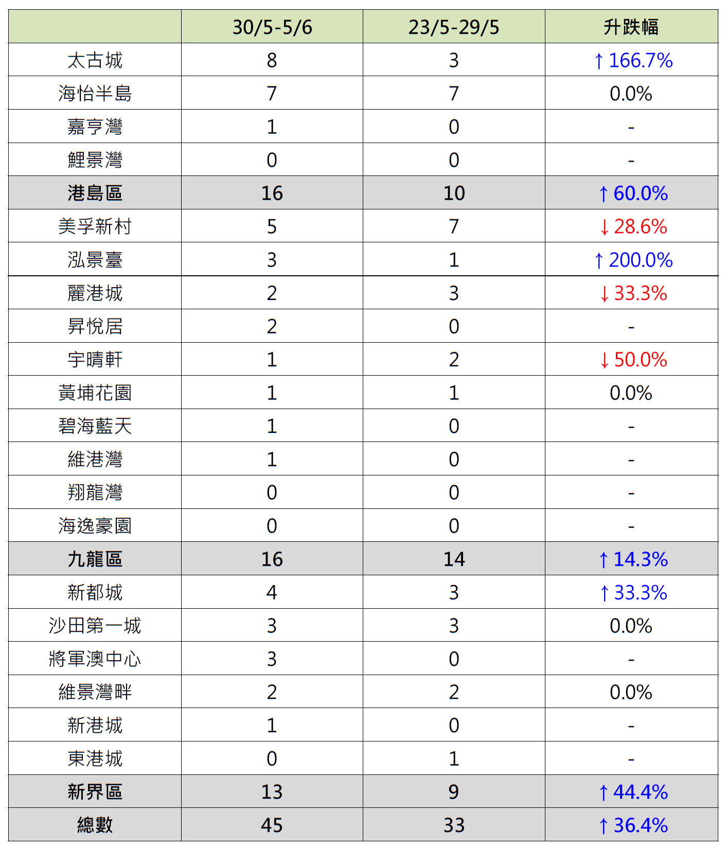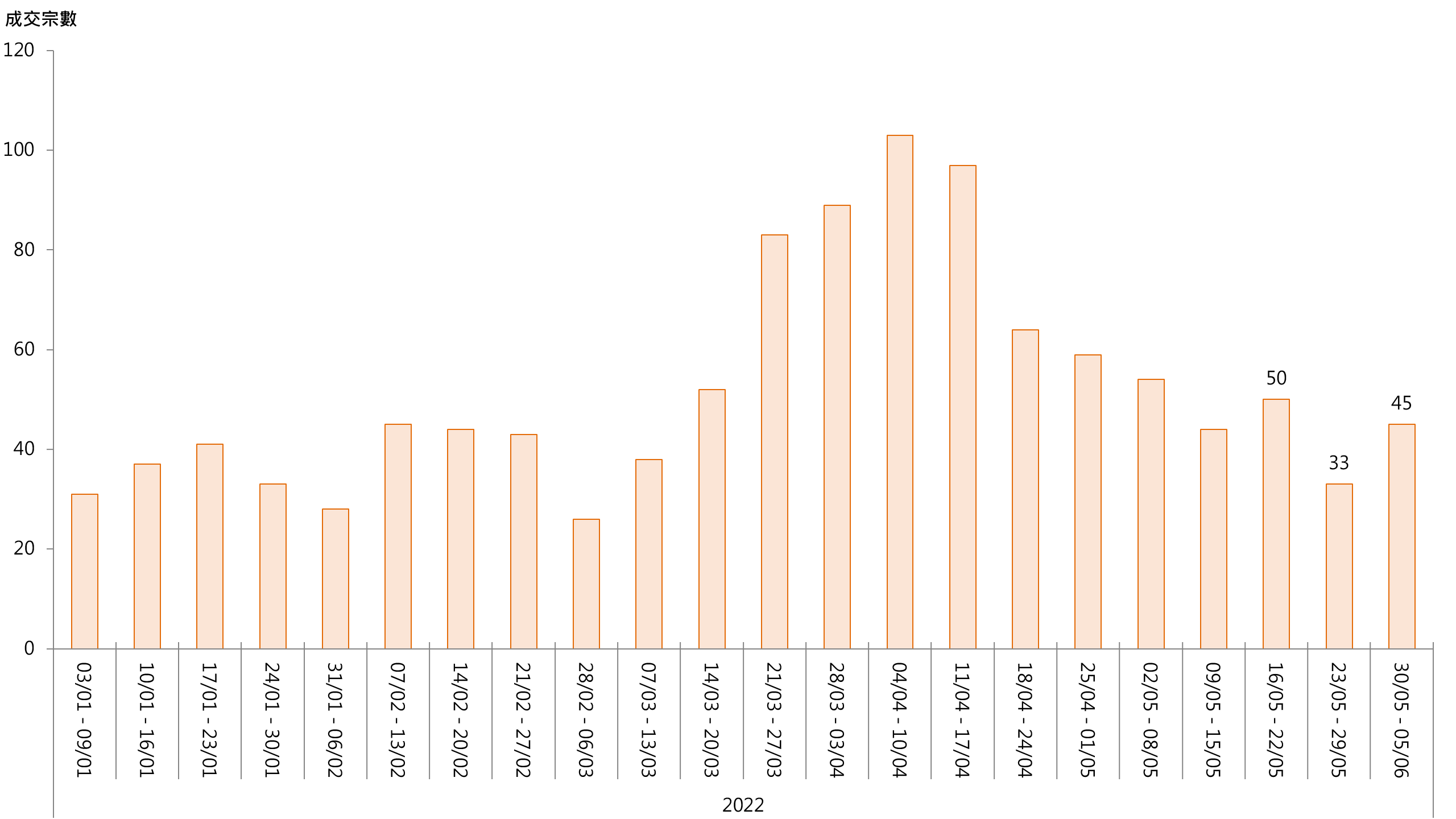 疫情穩定利好大市,新盤交投暢旺;部份向隅客回流二手市場,二手交投回穩;據本行前線分行所錄得的數字顯示,綜合過去一星期(5月30日至6月5日)全港20大主要屋苑二手買賣錄45宗成交,較前周(5月23日至5月29日)的33宗增加約36.4%(見圖)。