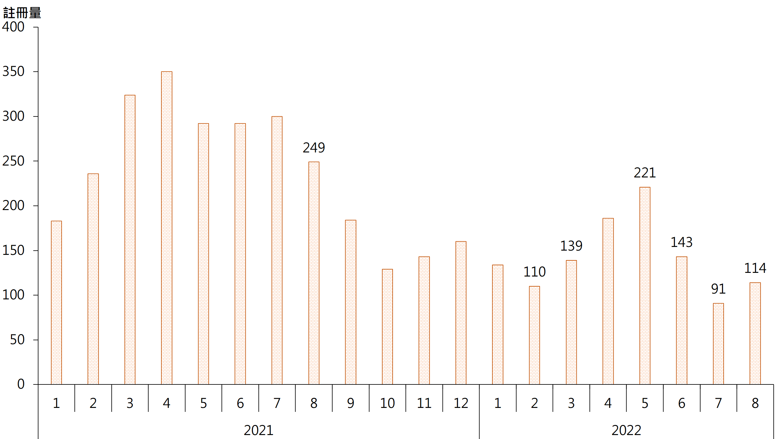 據土地註冊處資料顯示,8月將軍澳區20個私人屋苑錄114宗二手住宅註冊,較7月的91宗增加約25.3%,但仍是近半年次低(見圖)。鑑於簽署買賣合約至遞交到土地註冊處註冊登記需時,8月註冊個案一般主要反映7月市況。