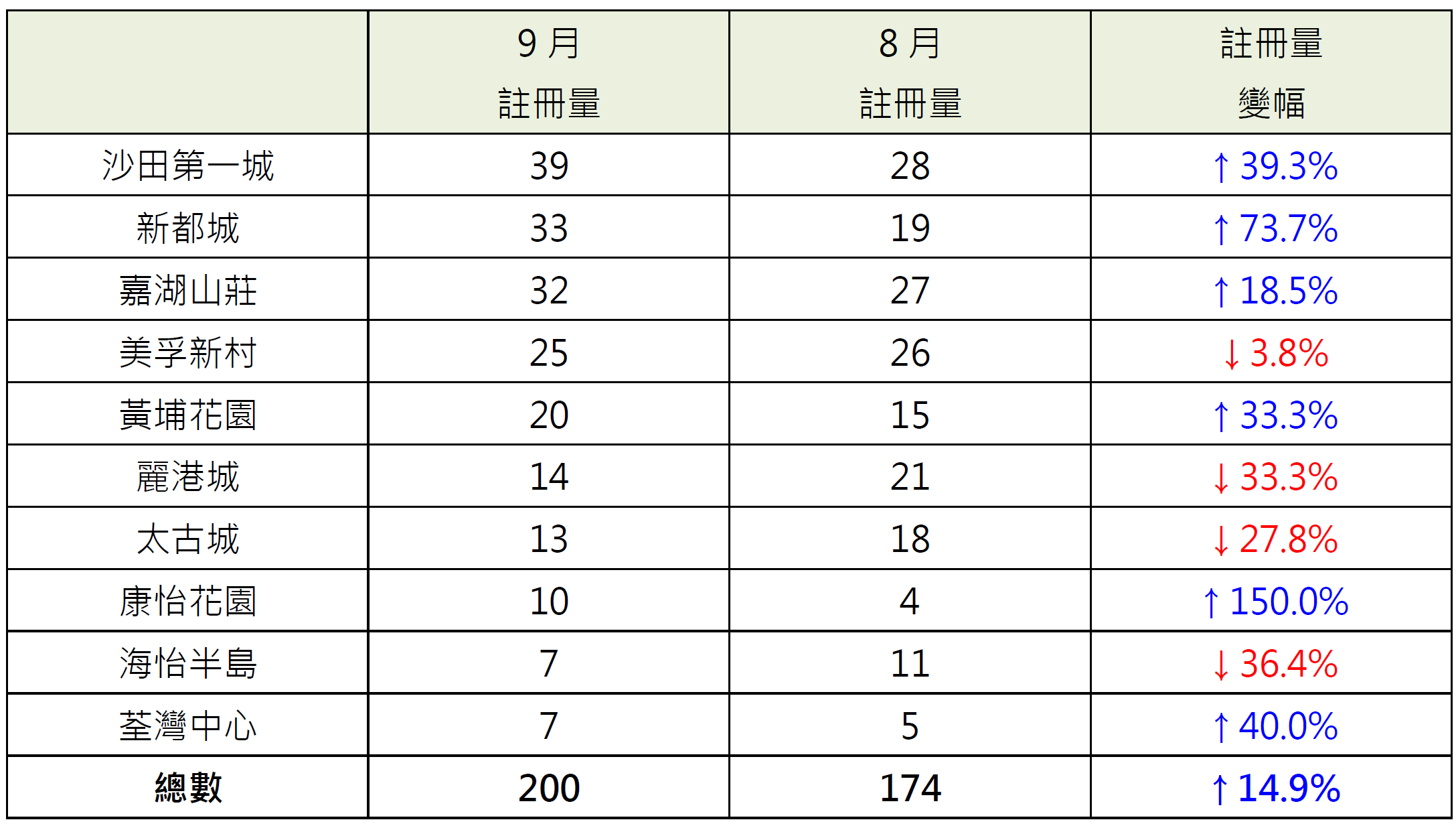 十大傳統屋苑中,有6個屋苑二手住宅註冊量按月報升,4個屋苑報跌;報升屋苑中,康怡花園錄10宗註冊,較8月的4宗增加1.5倍;新都城錄33宗註冊,較8月的19宗增加約73.7%;荃灣中心錄7宗註冊,較8月的5宗增加40%。