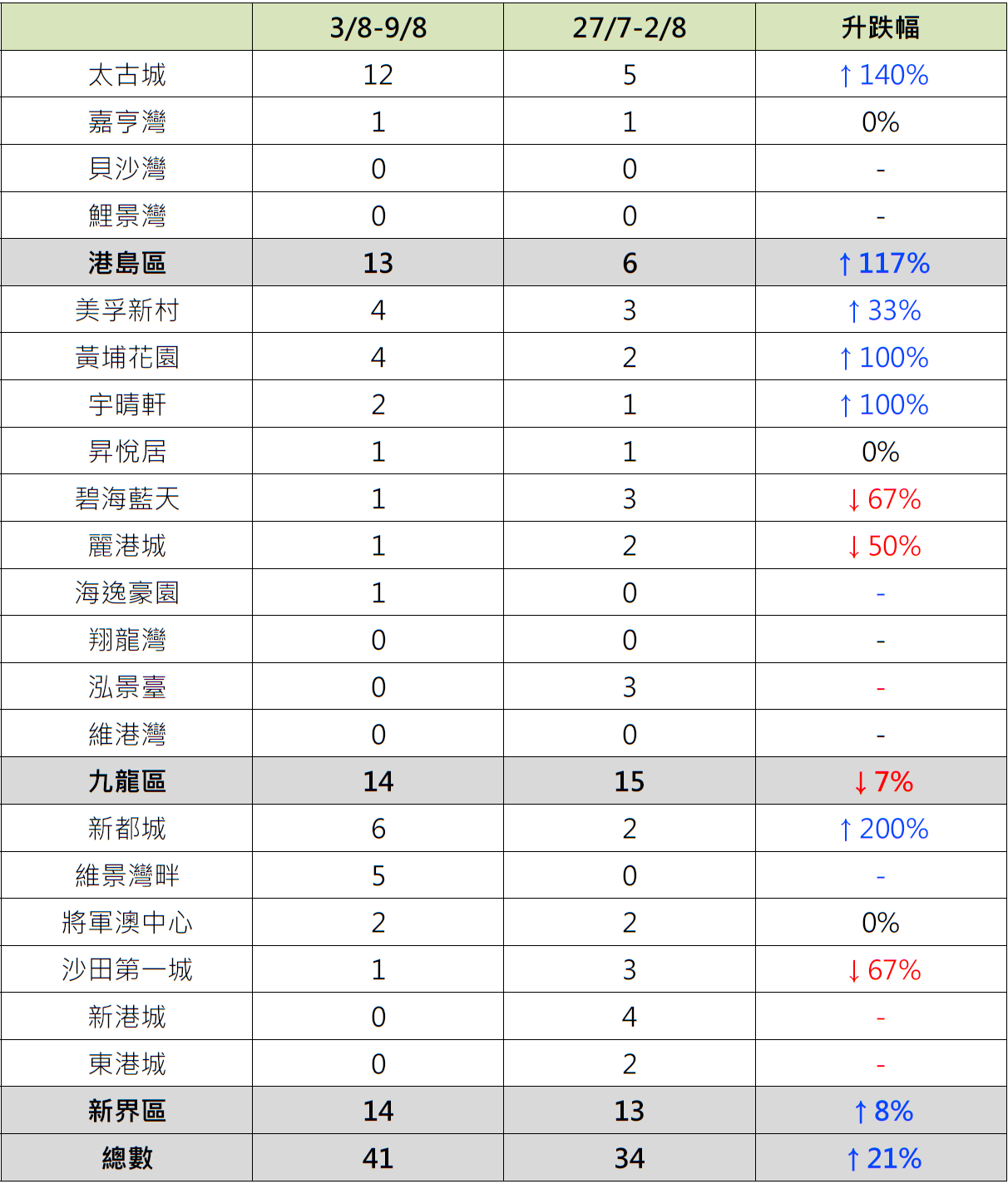 綜觀上周港島、九龍及新界三區屋苑按周交投表現,其中港島區4個指標屋苑上周錄13宗成交,按周增加近1.2倍;當中太古城錄12宗成交,按周增加1.4倍,成為港島區上周成交量上升的主要動力。
