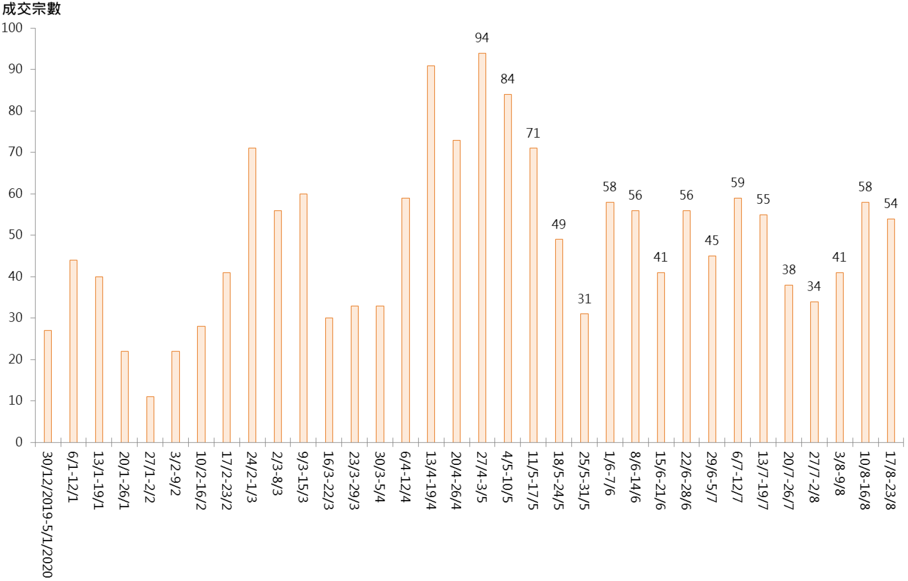 據本行前線分行所錄得的數字顯示,綜合過去一星期 (8月17日至8月23日) 全港20大主要屋苑二手買賣錄54宗成交,雖較前周(8月10日至8月16日)的58宗減少約7%,惟仍企穩逾50宗水平 (見圖)。
