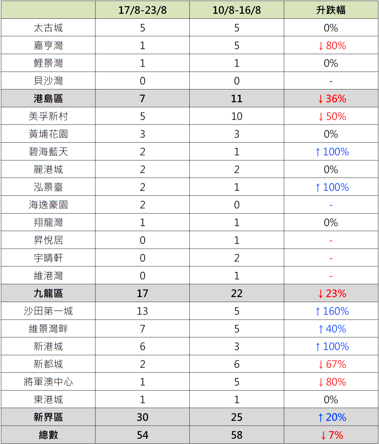 至於新界區6個指標屋苑上周錄30宗成交,按周增加20%;當中沙田第一城錄13宗成交,按周增加1.6倍;新港城錄6宗成交,按周增加1倍;維景灣畔錄7宗成交,按周增加40%;反觀,將軍澳中心錄1宗成交,按周減少80%;新都城錄2宗成交,按周減少約67%。