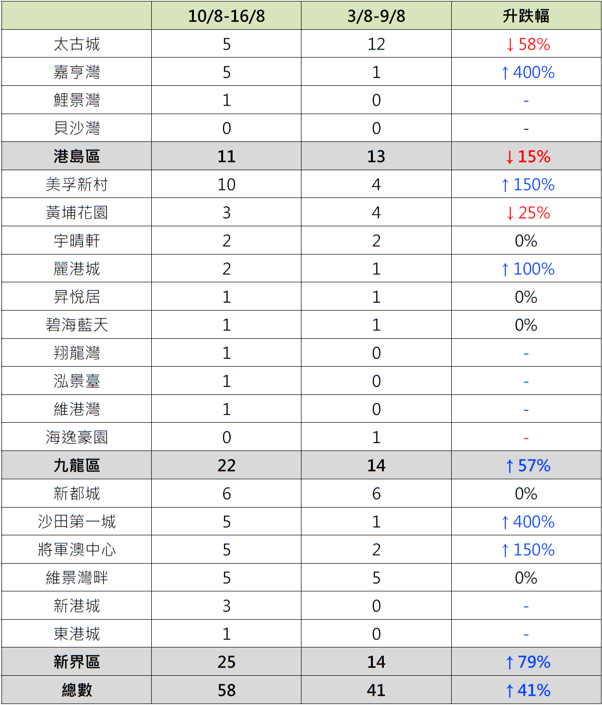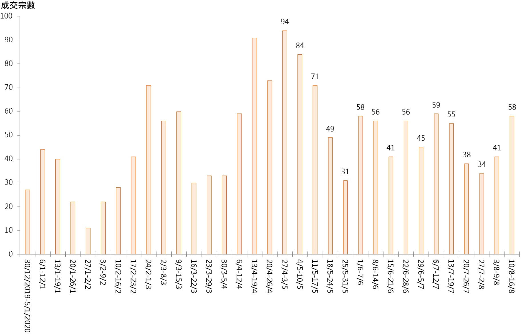 據本行前線分行所錄得的數字顯示,綜合過去一星期 (8月10日至8月16日) 全港20大主要屋苑二手買賣錄58宗成交,較前周(8月3日至8月9日)的41宗增加約41%,創近5周新高(見圖)。