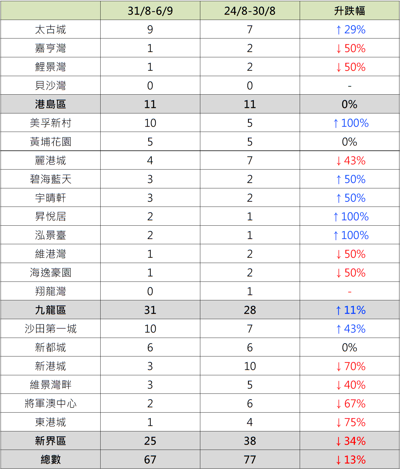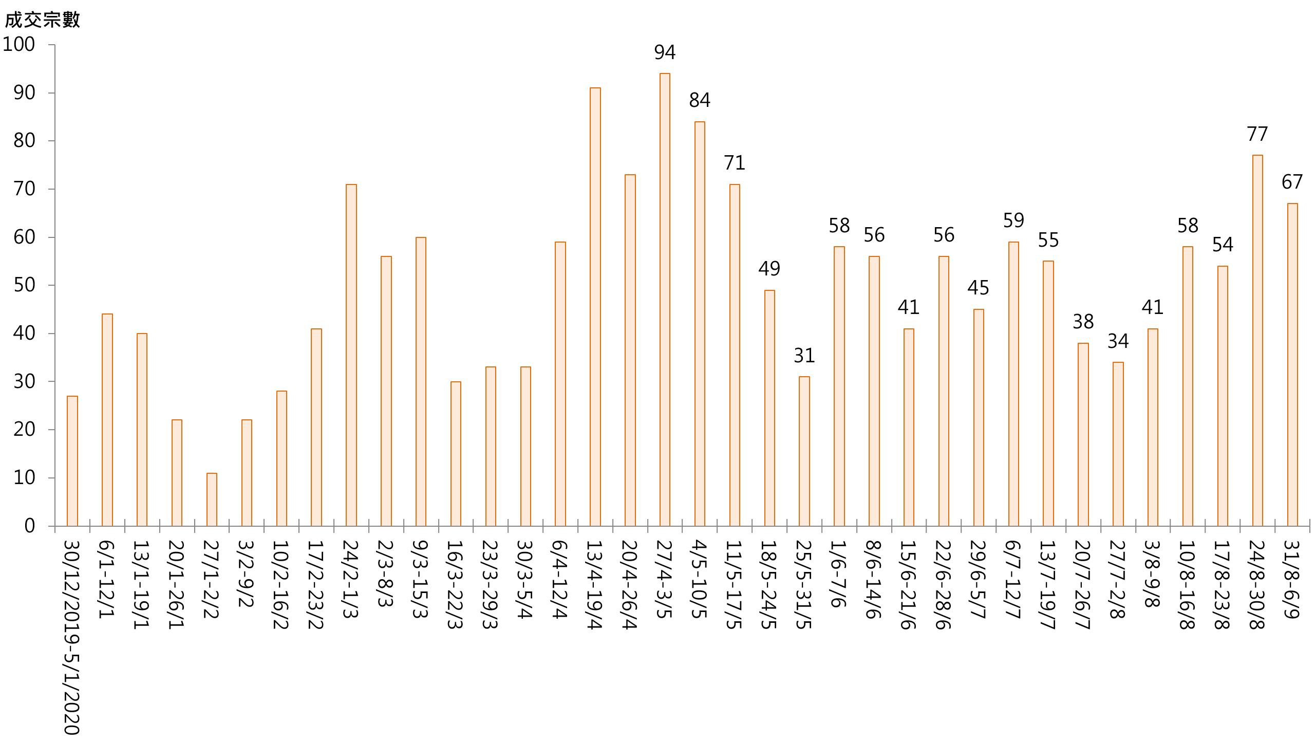 據本行前線分行所錄得的數字顯示,綜合過去一星期 (8月31日至9月6日) 全港20大主要屋苑二手買賣錄67宗成交,雖較前周(8月24日至8月30日)的77宗減少約13%,惟仍創近16周次高 (見圖)。