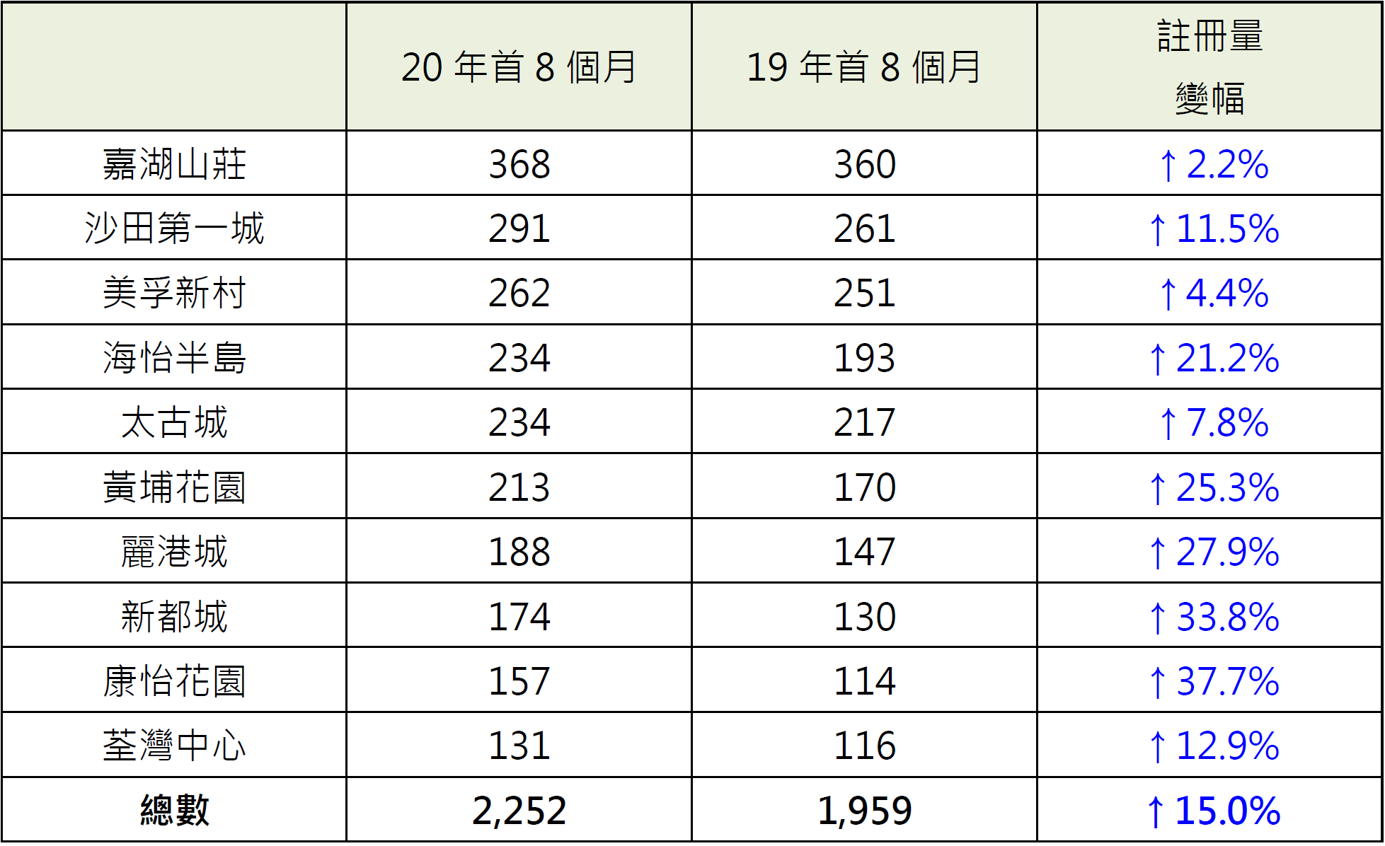 據土地註冊處資料顯示,整體二手住宅20年首8個月錄30,235宗註冊,較19年首8個月的29,766宗微增約1.6%;而十大傳統屋苑交投表現相對突出,今年首8個月共錄得2,252宗註冊,較去年同期的1,959宗增加約15.0%。