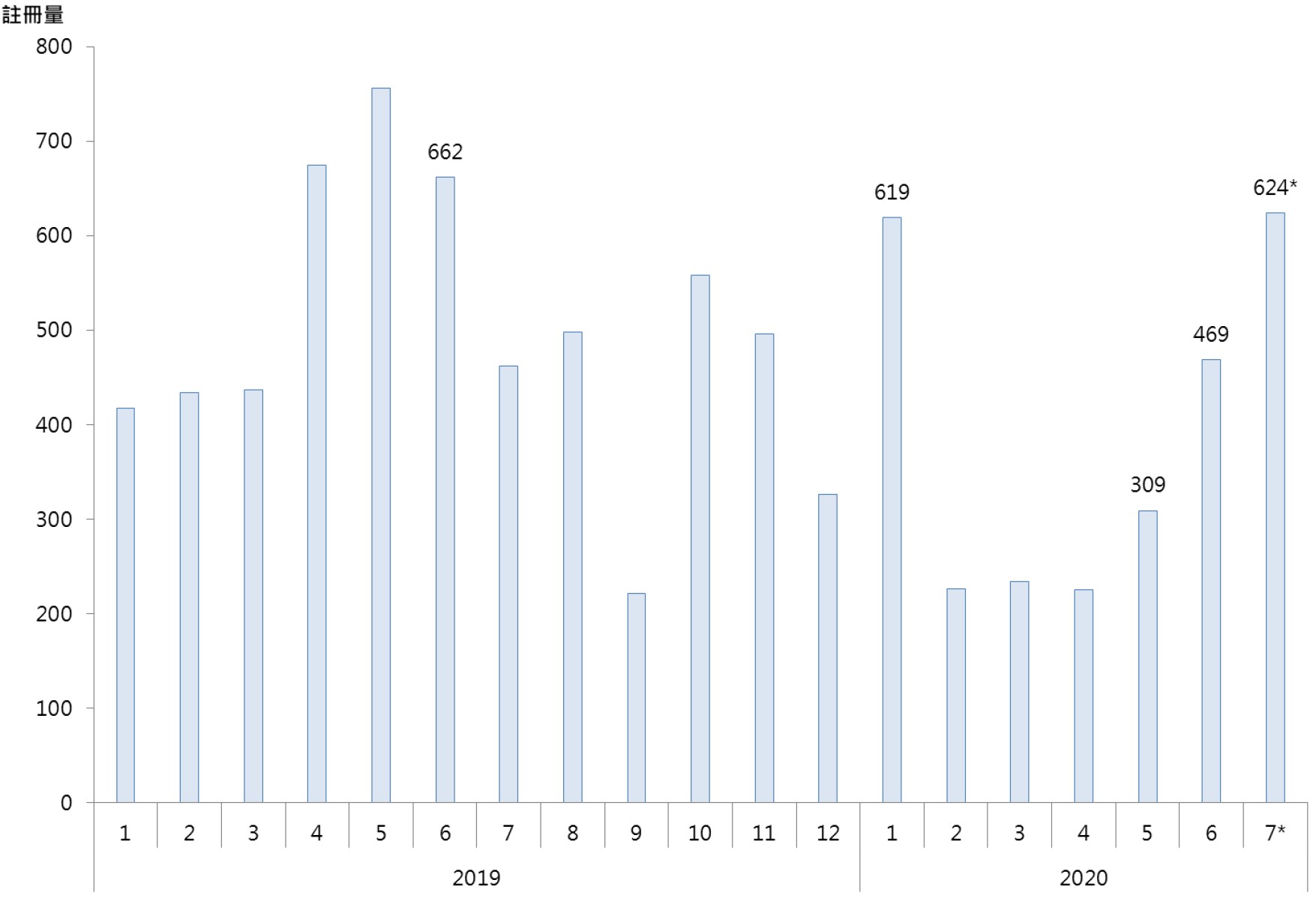 受惠車位拆售帶動,純車位註冊量上升。據土地註冊處資料顯示,7月(截至30日)錄624宗純車位註冊,較6月全月的469宗增加約33.0%,暫創近13個月新高 (見圖)。鑑於簽署買賣合約至遞交到土地註冊處註冊登記需時,7月註冊個案一般主要反映6月市況,而第三波疫情對車位市場的影響尚未反映。