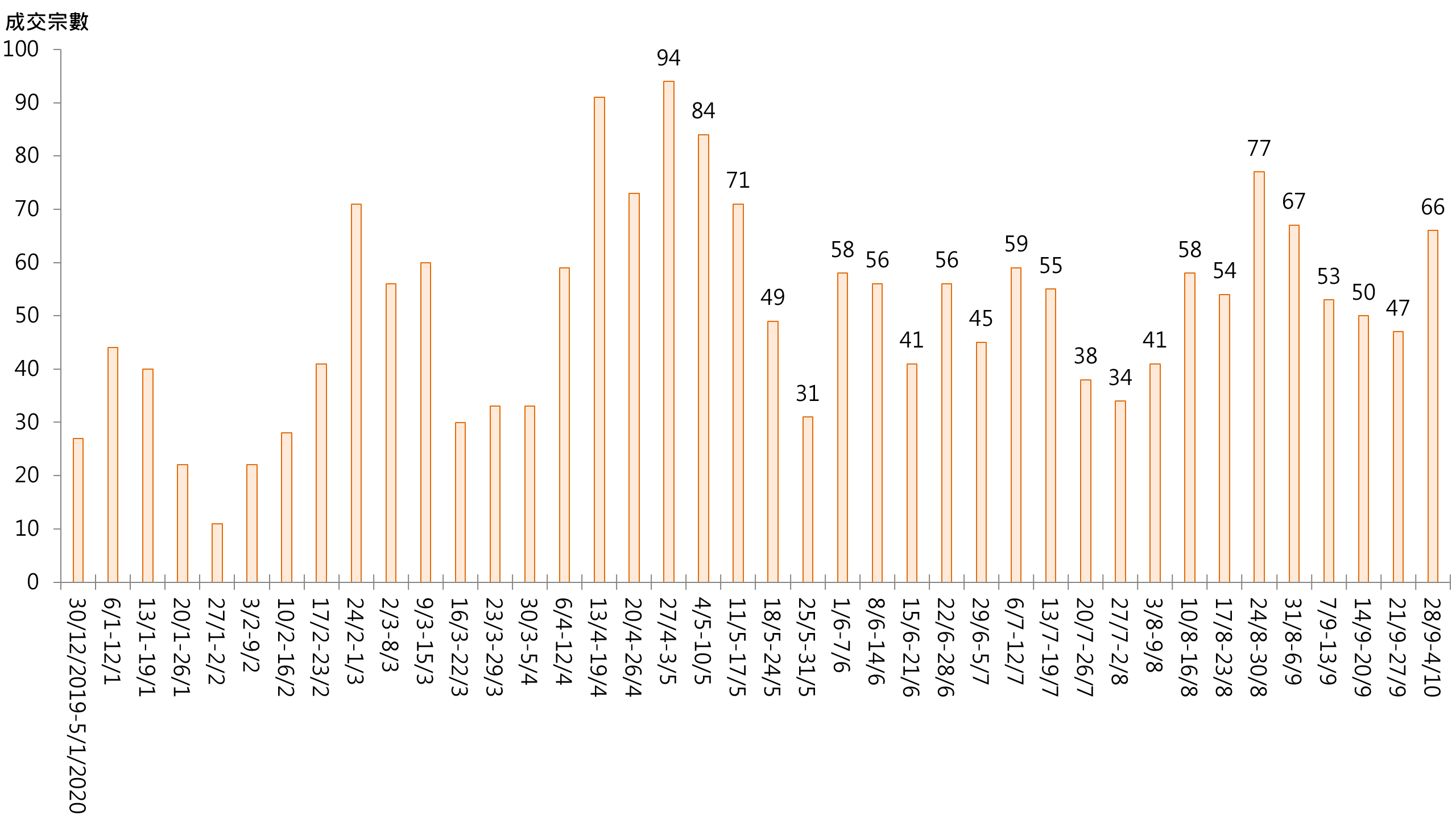 過去長假期帶動二手住宅睇樓活動轉趨頻繁,推升二手交投。據本行前線分行所錄得的數字顯示,綜合過去一星期 (9月28日至10月4日) 全港20大主要屋苑二手買賣錄66宗成交,較前周(9月21日至9月27日)的47宗增加約40%,創近4周新高 (見圖)。
