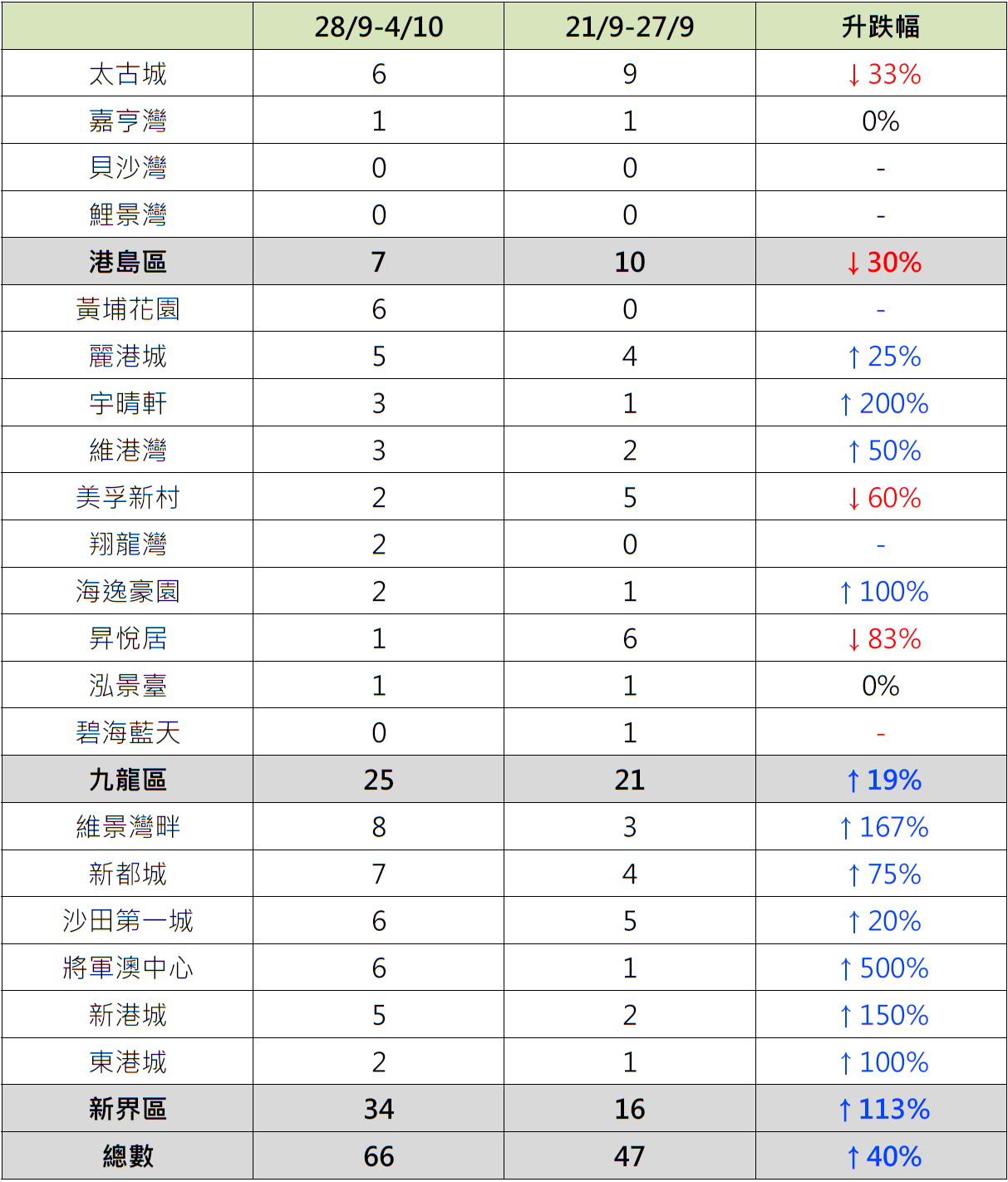 綜觀上周,港島、九龍及新界三區屋苑按周交投表現,其中新界區6個指標屋苑全線向上,上周共錄得34宗成交,按周增加逾1.1倍;當中將軍澳中心錄6宗成交,按周增加5倍;維景灣畔錄8宗成交,按周增加約1.7倍;新港城錄5宗成交,按周增加1.5倍;新都城錄7宗成交,按周增加75%;沙田第一城錄6宗成交,按周增加20%。