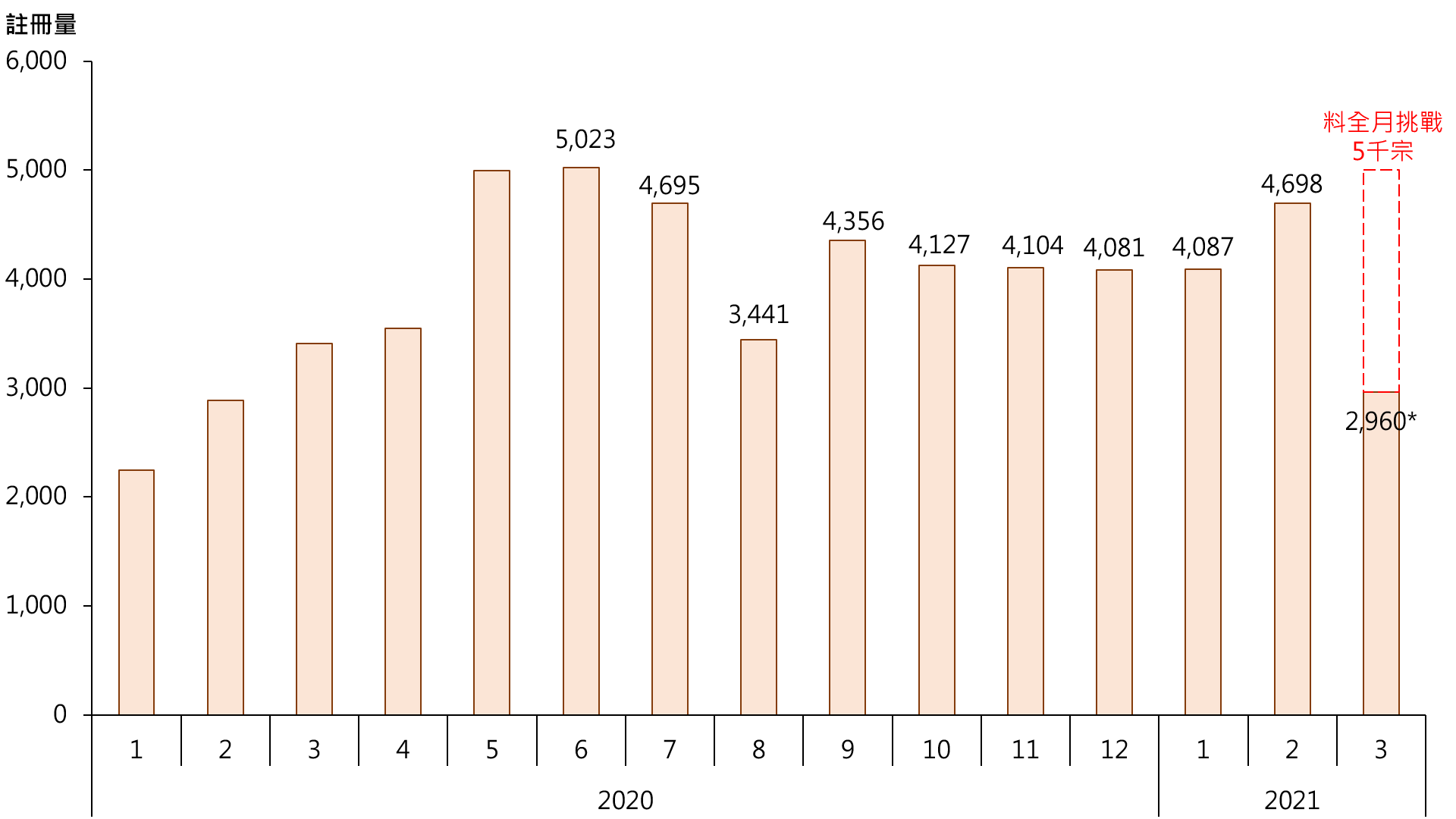 鑑於簽署買賣合約至遞交到土地註冊處註冊登記需時,每月註冊個案一般主要反映前一個月市況